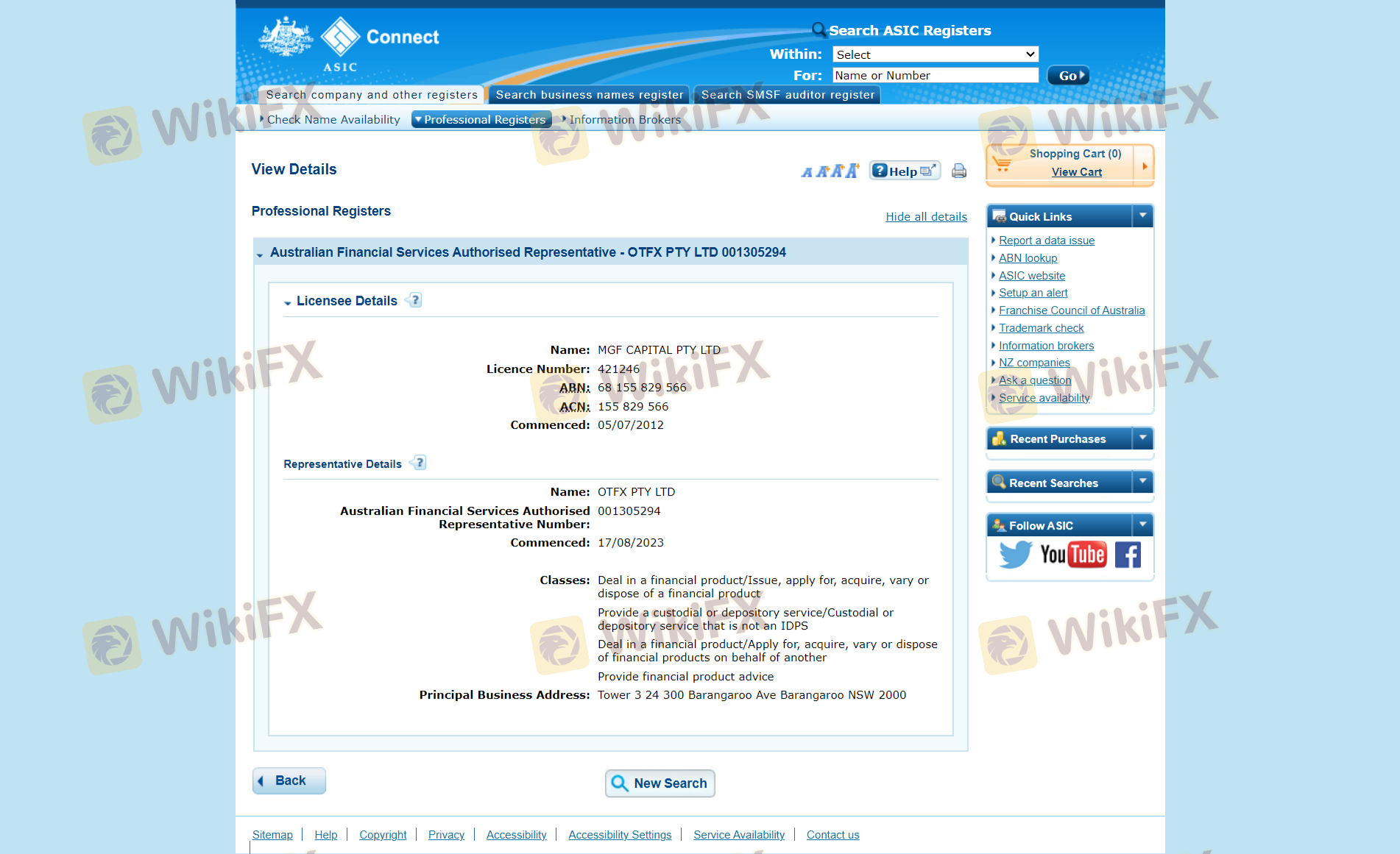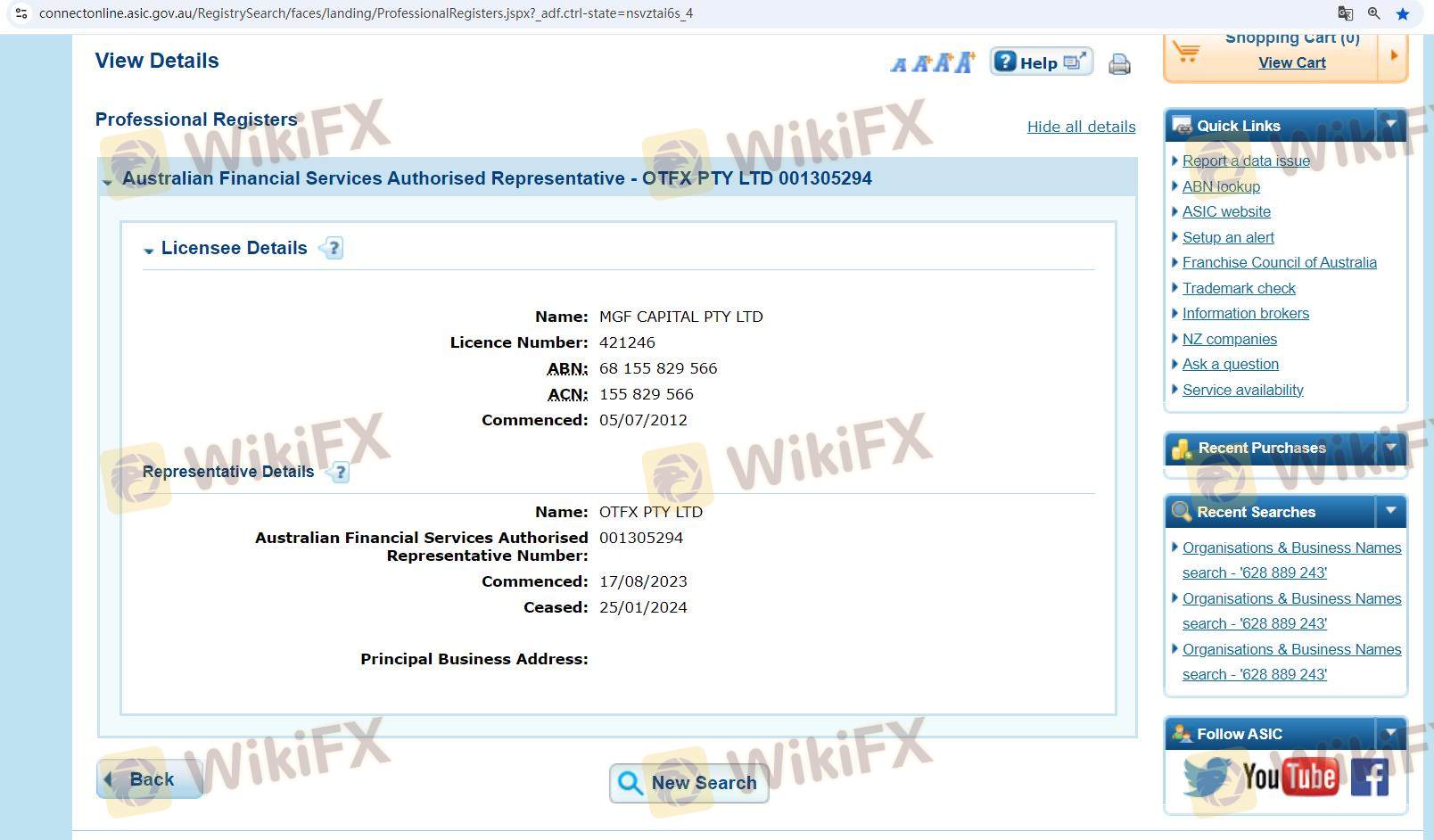 Catatan NFA menunjukkan bahwa OTFX bukan anggota, yang bertentangan langsung dengan klaimnya diatur oleh otoritas ini. Selain itu, meskipun OTFX terdaftar di FINTRAC, organisasi ini terutama berfokus pada anti-pencucian uang dan tidak mengatur aktivitas trading forex, yang menimbulkan kekhawatiran tentang legitimasi operasional broker. Lisensi ASIC yang dimiliki OTFX adalah lisensi Authorized Representative (AR) dari MGF Capital Pty Ltd, perusahaan yang dikenal menerbitkan lisensi ke banyak entitas, beberapa di antaranya telah ditandai sebagai penipuan. Ini menunjukkan kurangnya pengawasan regulasi yang ketat, yang sangat penting untuk memastikan keamanan dana klien.