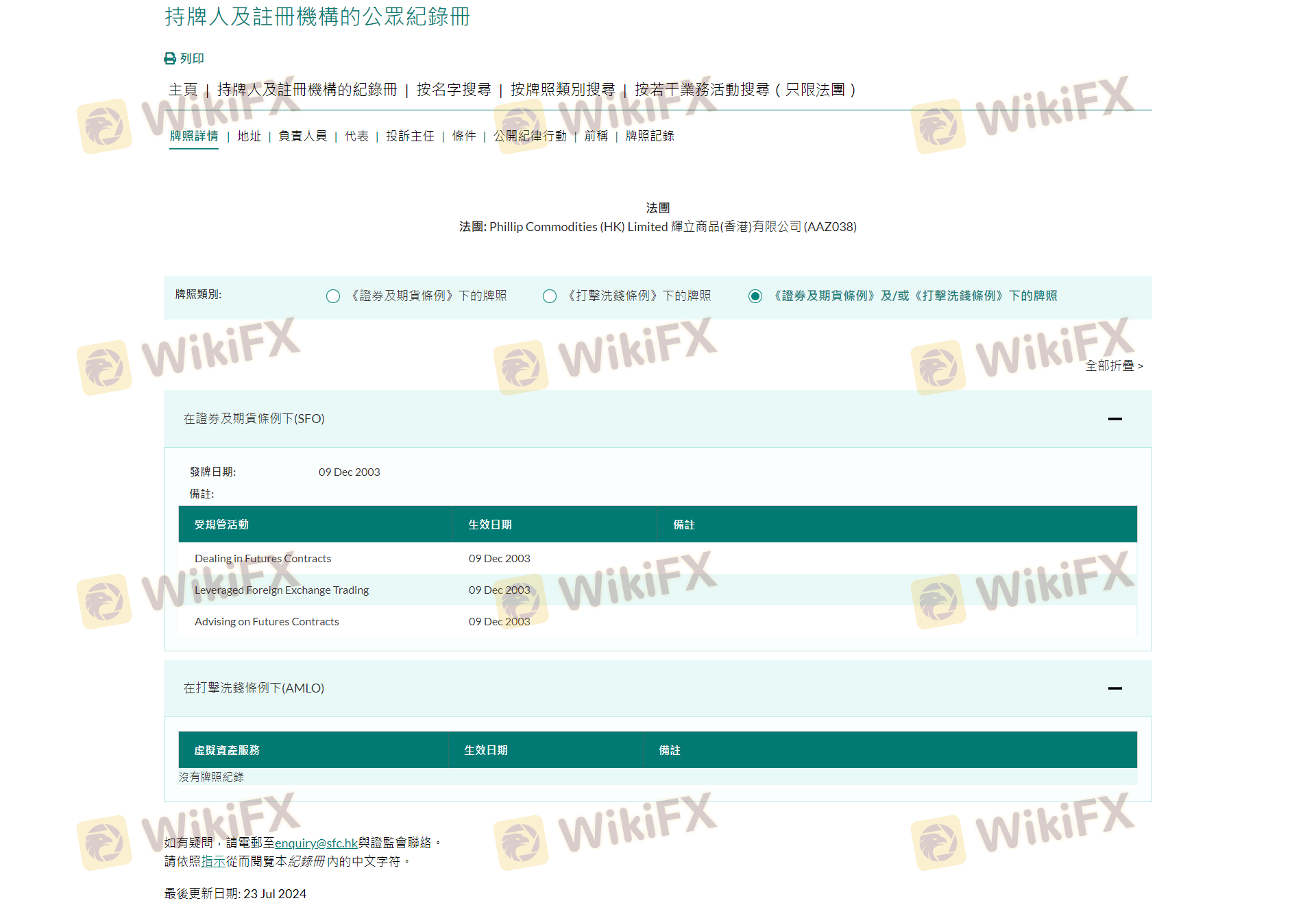 Status regulasi broker adalah faktor penting dalam menentukan legitimasi dan keamanannya bagi trader. Phillip Securities Group diatur oleh Securities and Futures Commission (SFC) Hong Kong, yang dikenal dengan kerangka regulasi yang ketat. Pengawasan regulasi memastikan bahwa broker mematuhi standar dan praktik keuangan tertentu, memberikan tingkat perlindungan untuk dana trader. Berikut adalah ringkasan informasi regulasi untuk Phillip Securities Group: