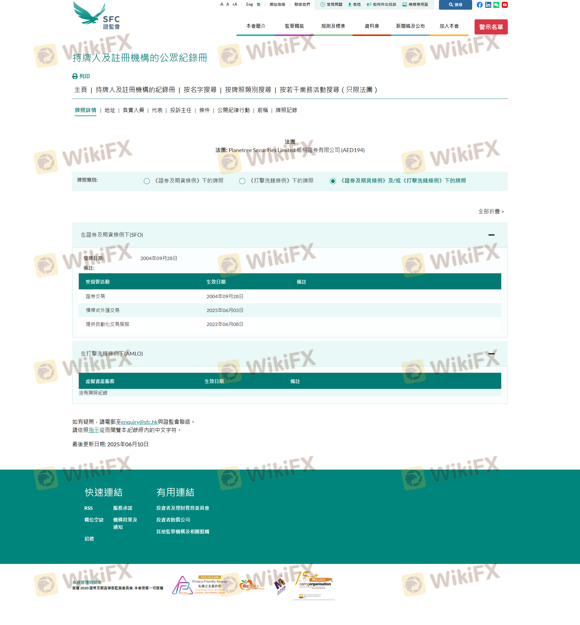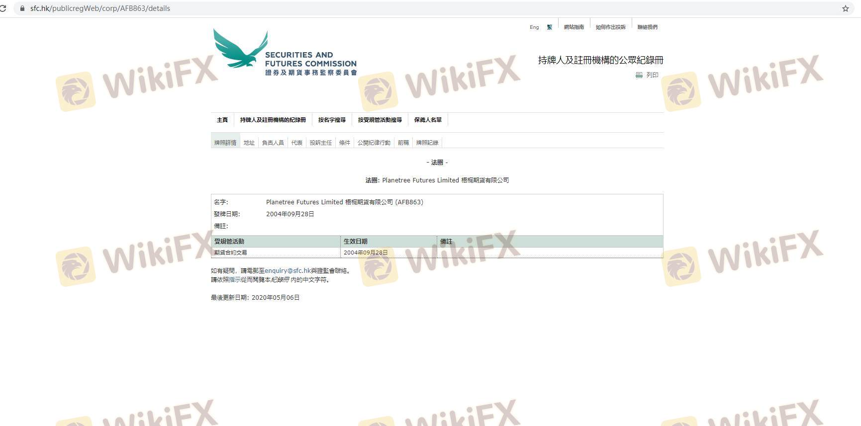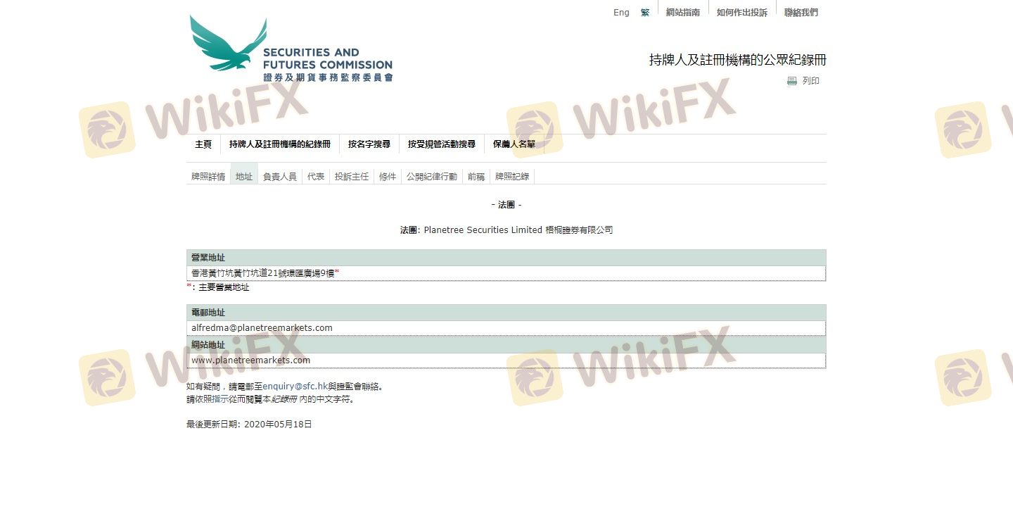Mengenai legitimasi broker forex Planetree INTERNATIONAL, ia menyediakan Hong Kong SFC, Hong Kong SFC, dan (Kami juga melakukan investigasi lapangan terkait aspek keamanan.).