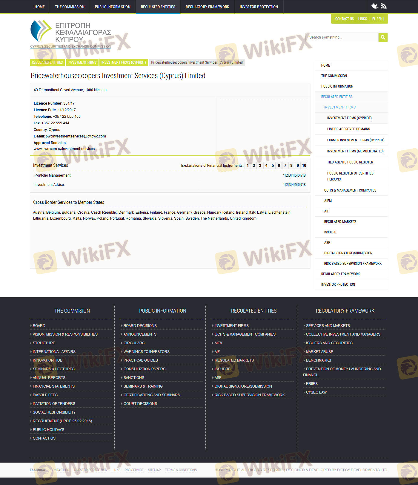 Mengenai legitimasi broker forex PWC, ia menyediakan Siprus CYSEC, dan (Kami juga melakukan investigasi lapangan terkait aspek keamanan.).