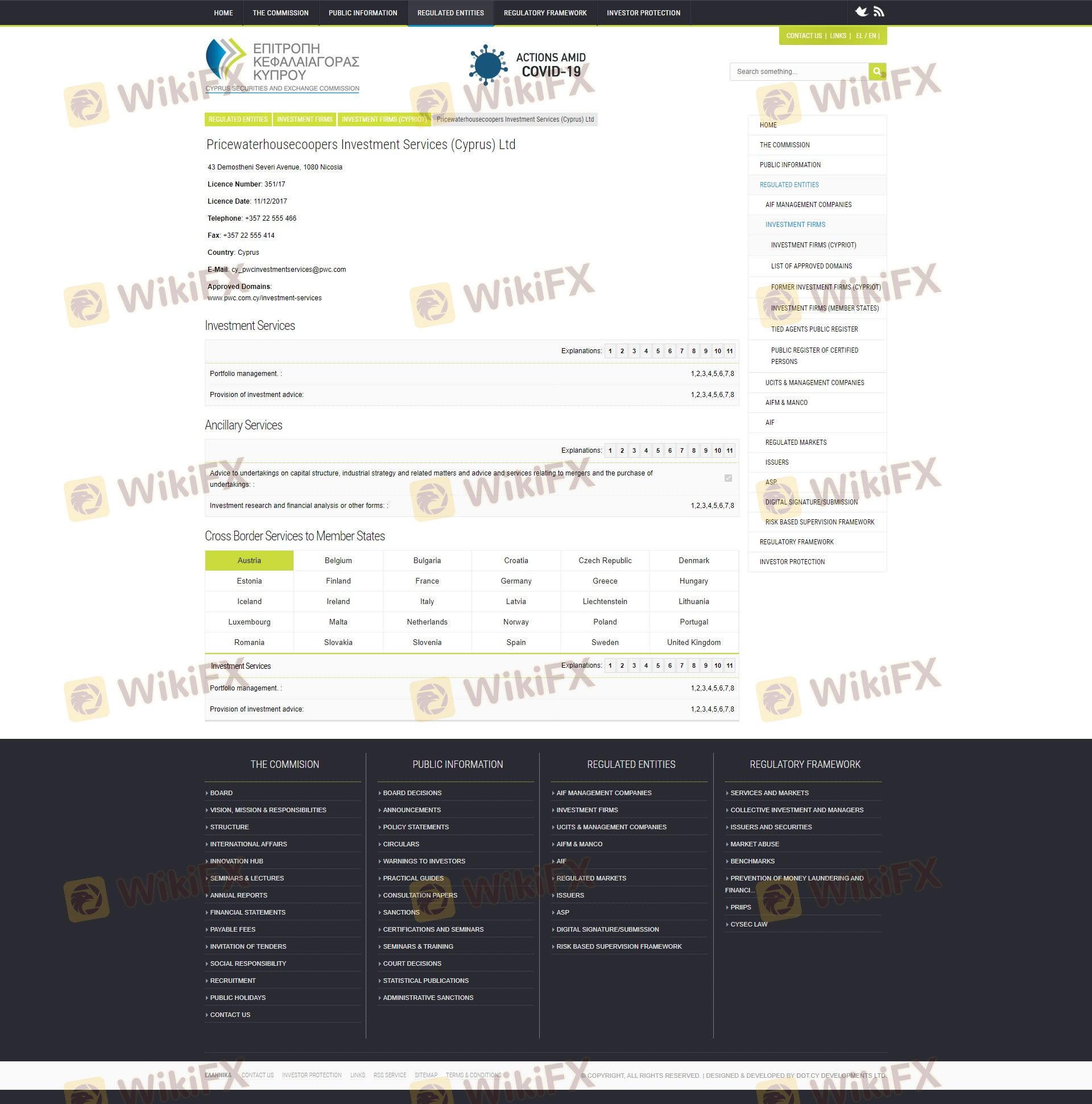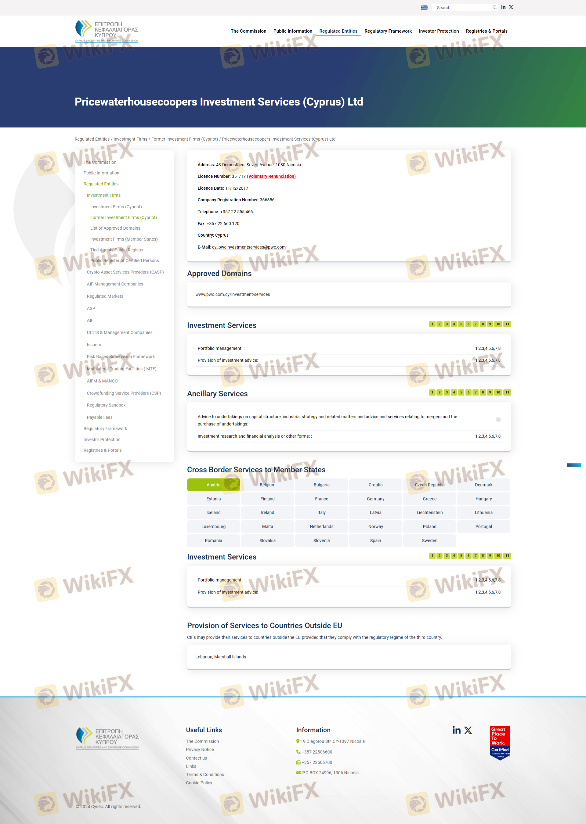 Status regulasi seorang broker adalah aspek fundamental yang menentukan legitimasi dan keamanannya bagi trader. PWC diatur oleh Cyprus Securities and Exchange Commission (CySEC), yang merupakan otoritas regulasi yang diakui di Uni Eropa. Pentingnya regulasi terletak pada perlindungan yang ditawarkan kepada trader, memastikan bahwa broker mematuhi standar operasional yang ketat dan menjaga transparansi dalam transaksi mereka. Berikut adalah ringkasan informasi regulasi PWC: