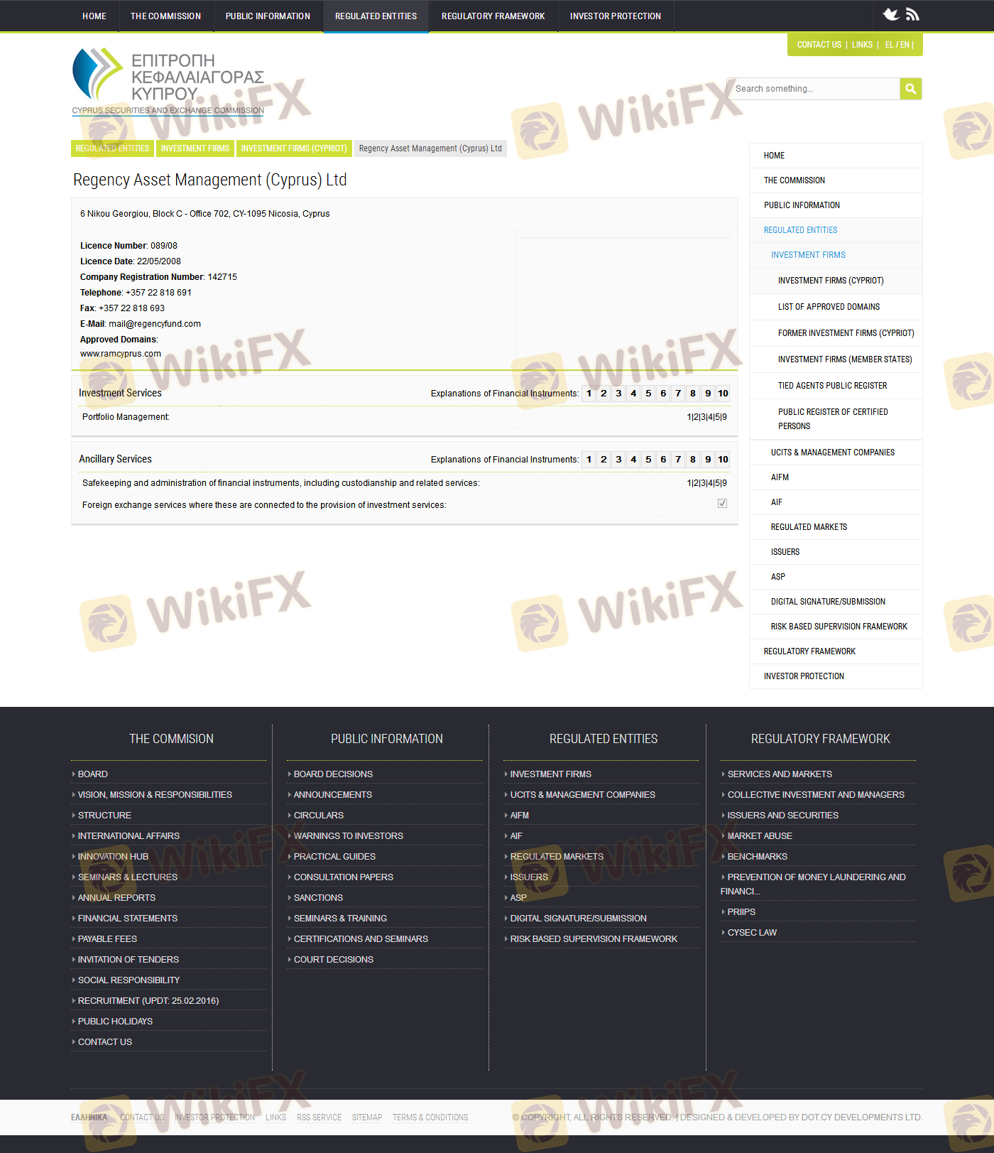 Mengenai legitimasi broker forex RAM Cyprus, ia menyediakan Siprus CYSEC, dan (Kami juga melakukan investigasi lapangan terkait aspek keamanan.).