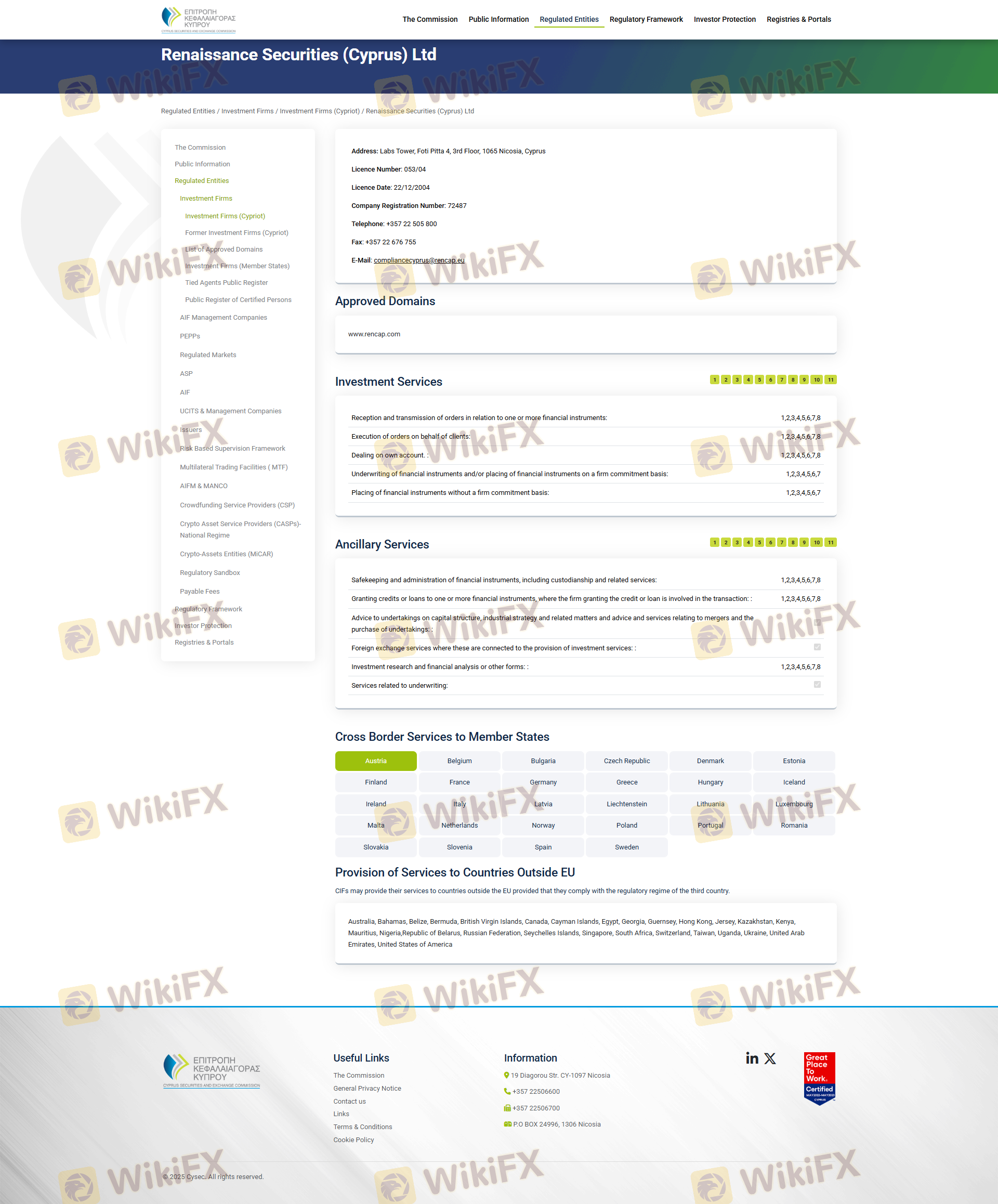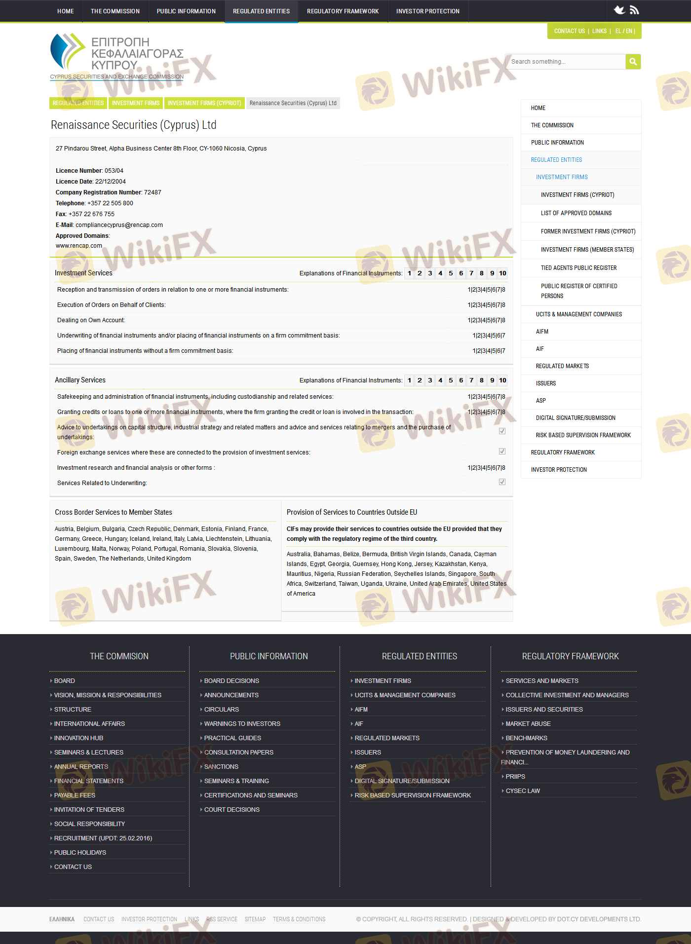 Renaissance Capital beroperasi di bawah pengawasan Cyprus Securities and Exchange Commission (CySEC), yang merupakan aspek penting dari legitimasinya. Pengawasan regulasi sangat penting untuk setiap broker forex, karena memastikan kepatuhan terhadap standar industri yang dirancang untuk melindungi trader. Broker yang diatur tunduk pada audit rutin dan harus mematuhi aturan ketat mengenai kecukupan modal, perlindungan dana klien, dan transparansi operasional.