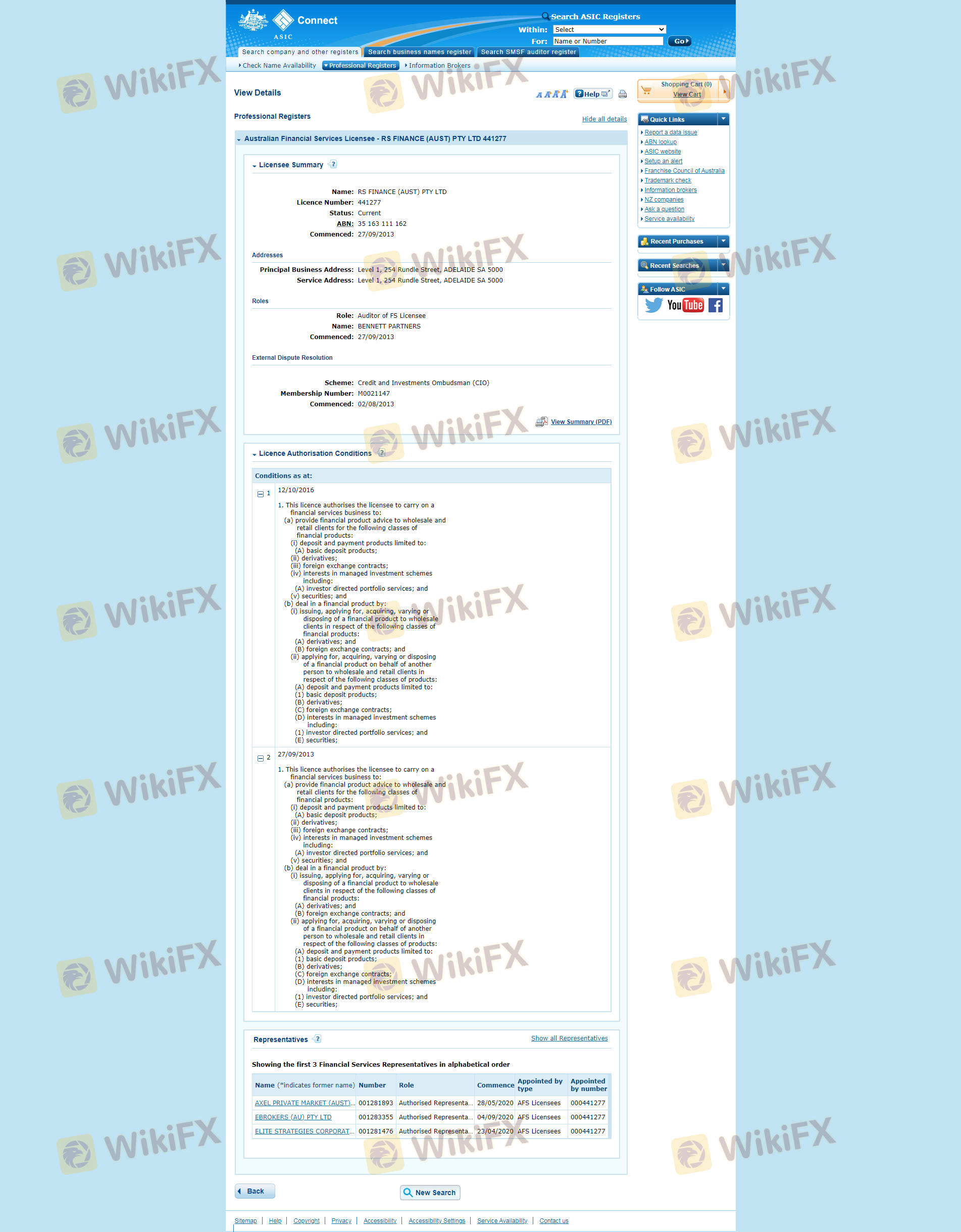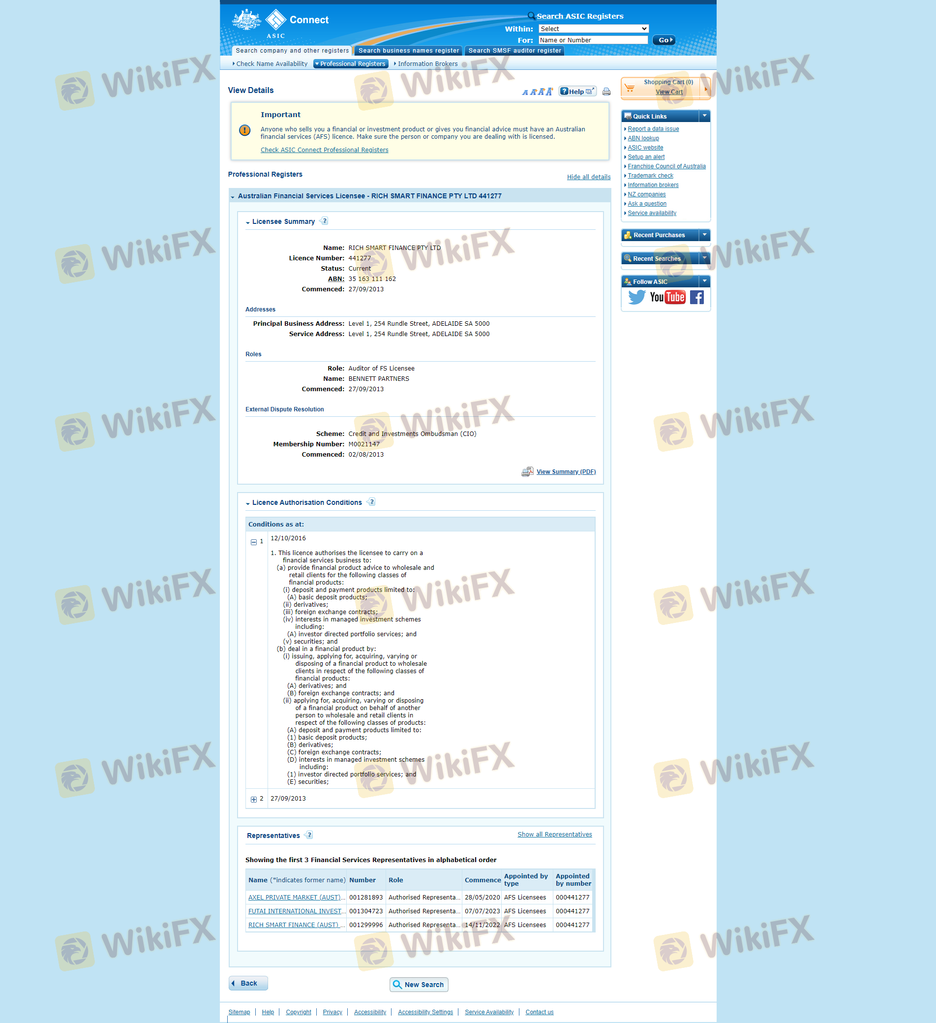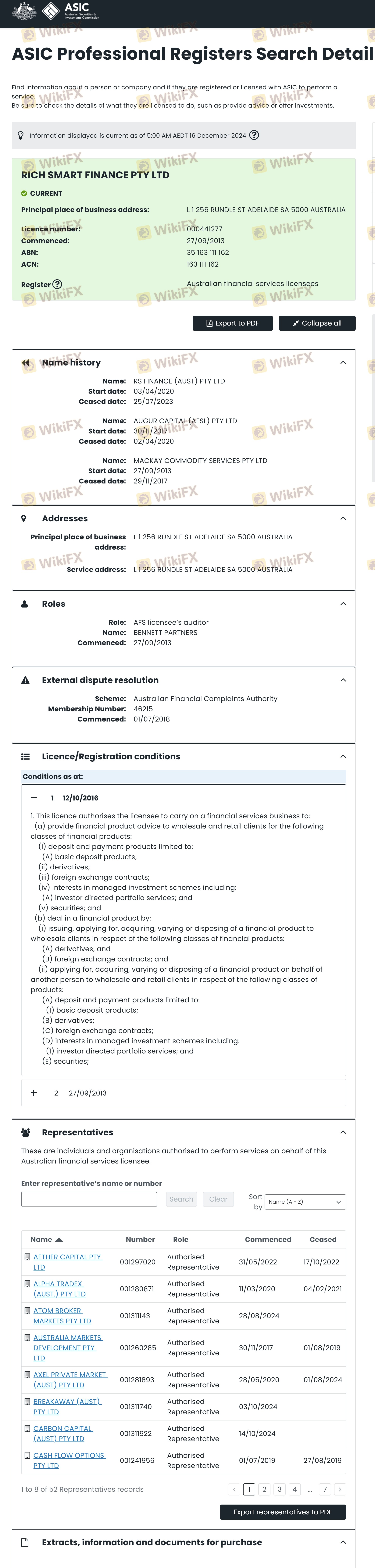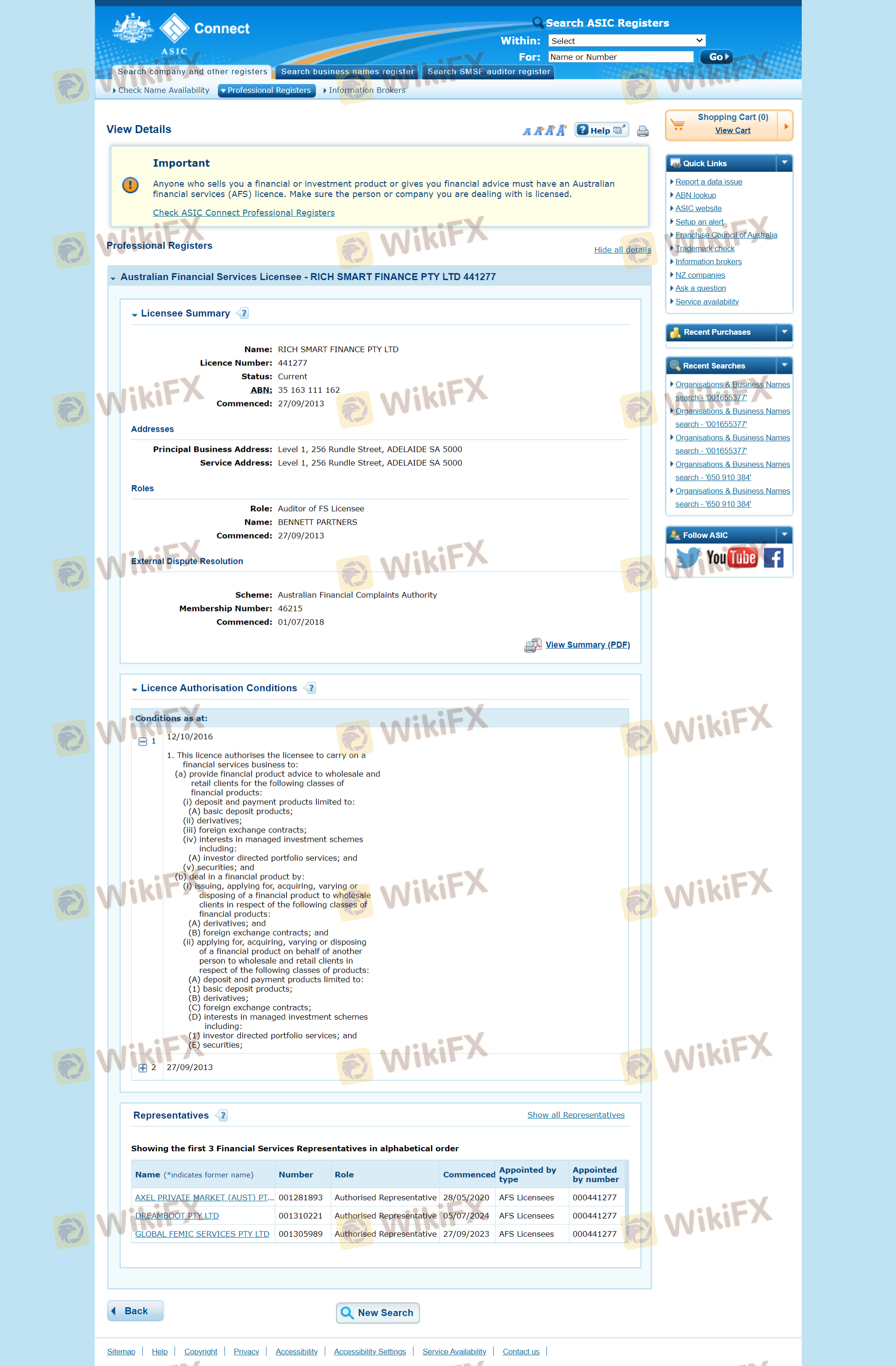Salah satu faktor paling kritis dalam menentukan apakah Rock Shield Capital pasars aman adalah status regulasinya. Regulasi berfungsi sebagai langkah perlindungan bagi para trader, memastikan bahwa broker mematuhi standar industri dan menjaga transparansi dalam operasinya. Rock Shield Capital pasars beroperasi dengan nama bisnis Rich Smart Finance dan diatur oleh Australian Securities and Investments Commission (ASIC), yang dikenal dengan kerangka regulasinya yang ketat.