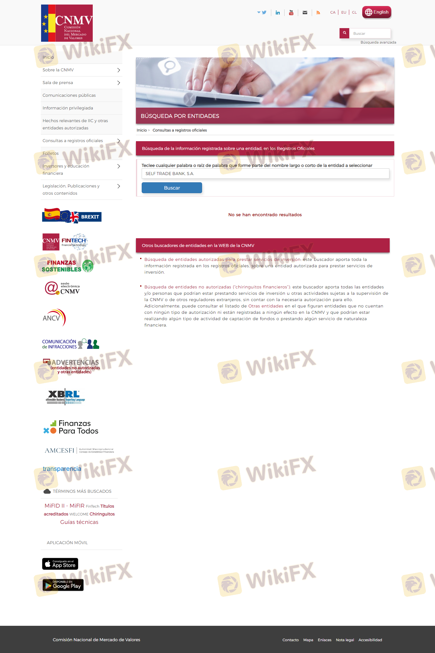 Lingkungan regulasi di mana seorang broker beroperasi adalah indikator kunci dari keamanan dan legitimasinya. Self Bank diatur oleh Bank of Spain, yang memberikan tingkat pengawasan yang sangat penting untuk melindungi kepentingan klien. Namun, terdapat laporan yang bervariasi mengenai status regulasinya, dengan beberapa sumber mengindikasikan bahwa ia beroperasi dalam kapasitas "klon yang mencurigakan", menimbulkan kekhawatiran tentang legitimasinya dan kepatuhan terhadap praktik terbaik di industri keuangan.