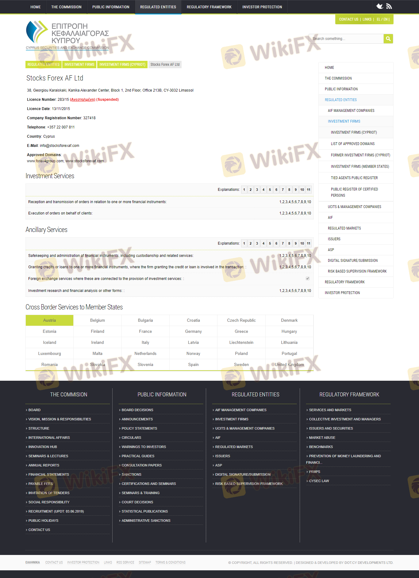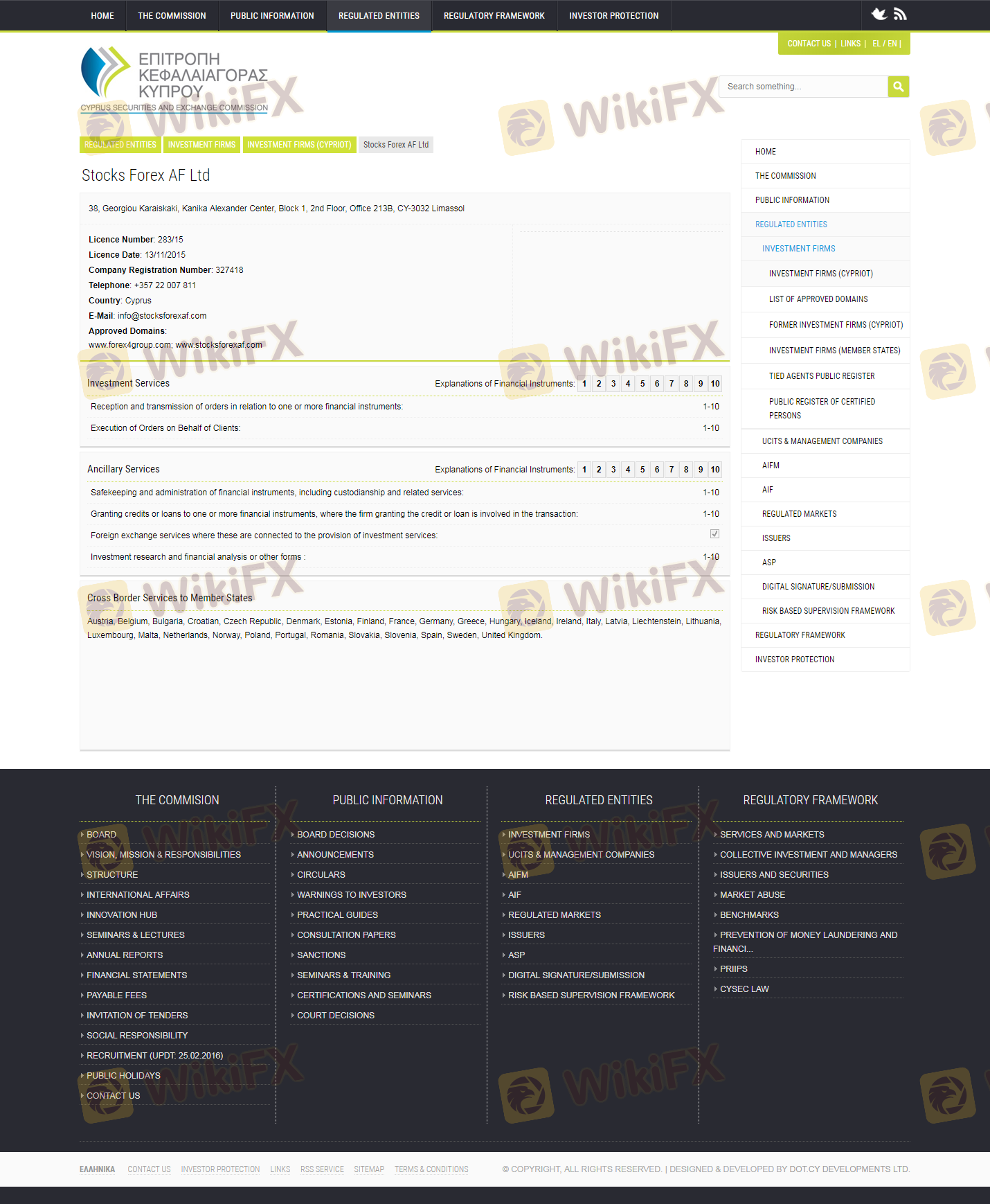 Mengenai legitimasi broker forex Stocks Forex AF, ia menyediakan Siprus CYSEC, dan (Kami juga melakukan investigasi lapangan terkait aspek keamanan.).