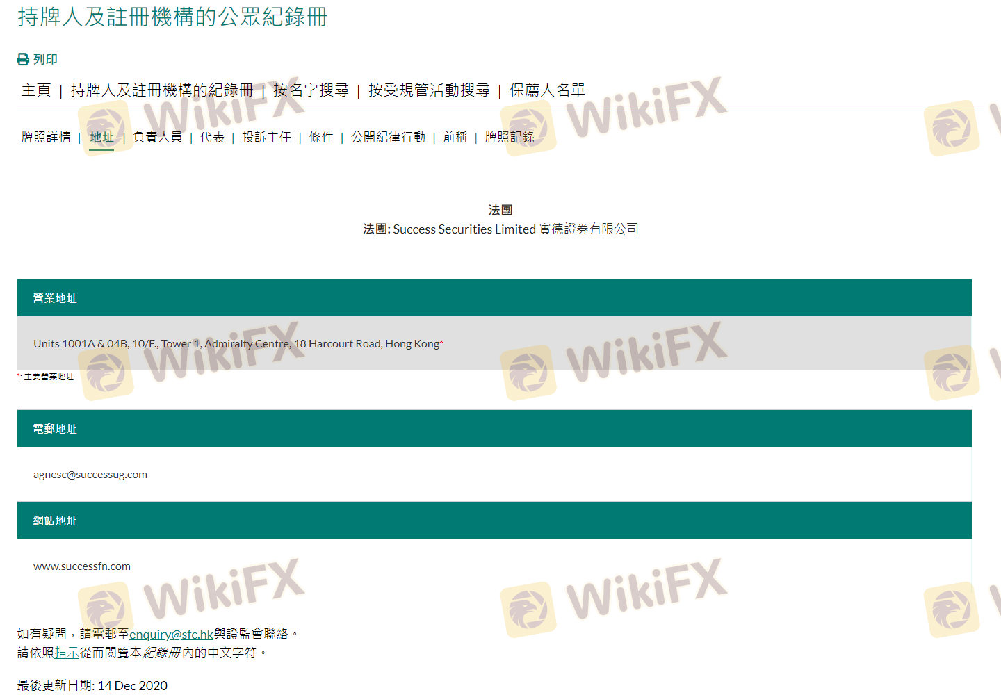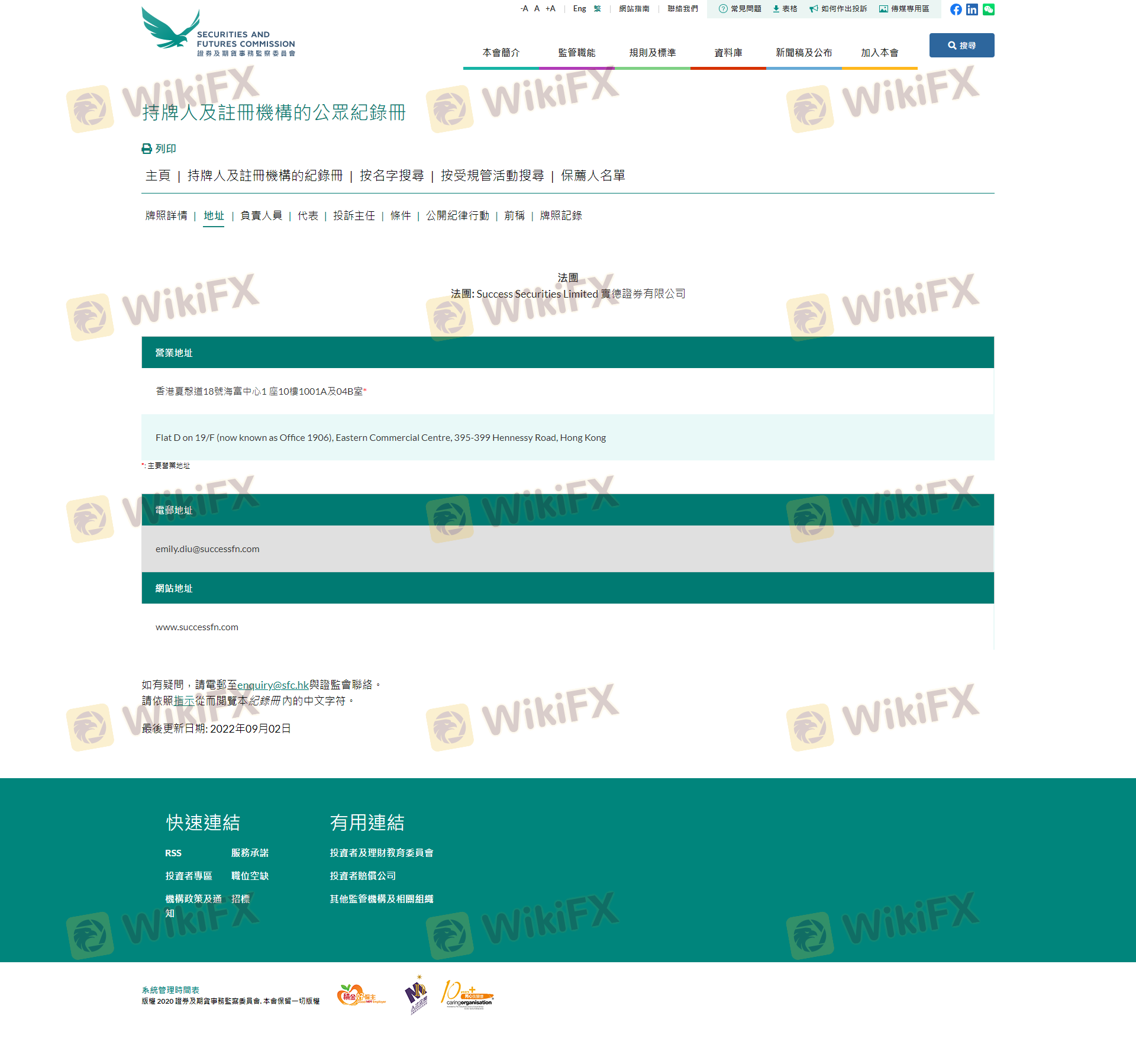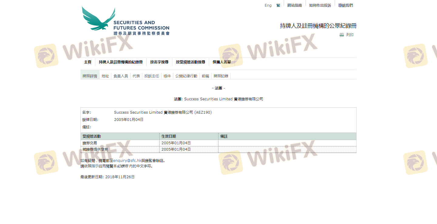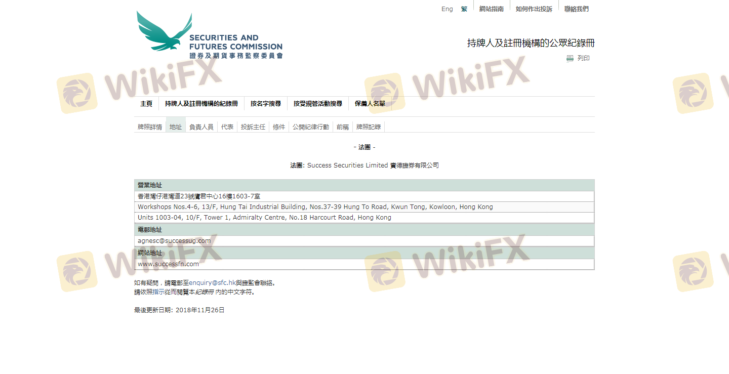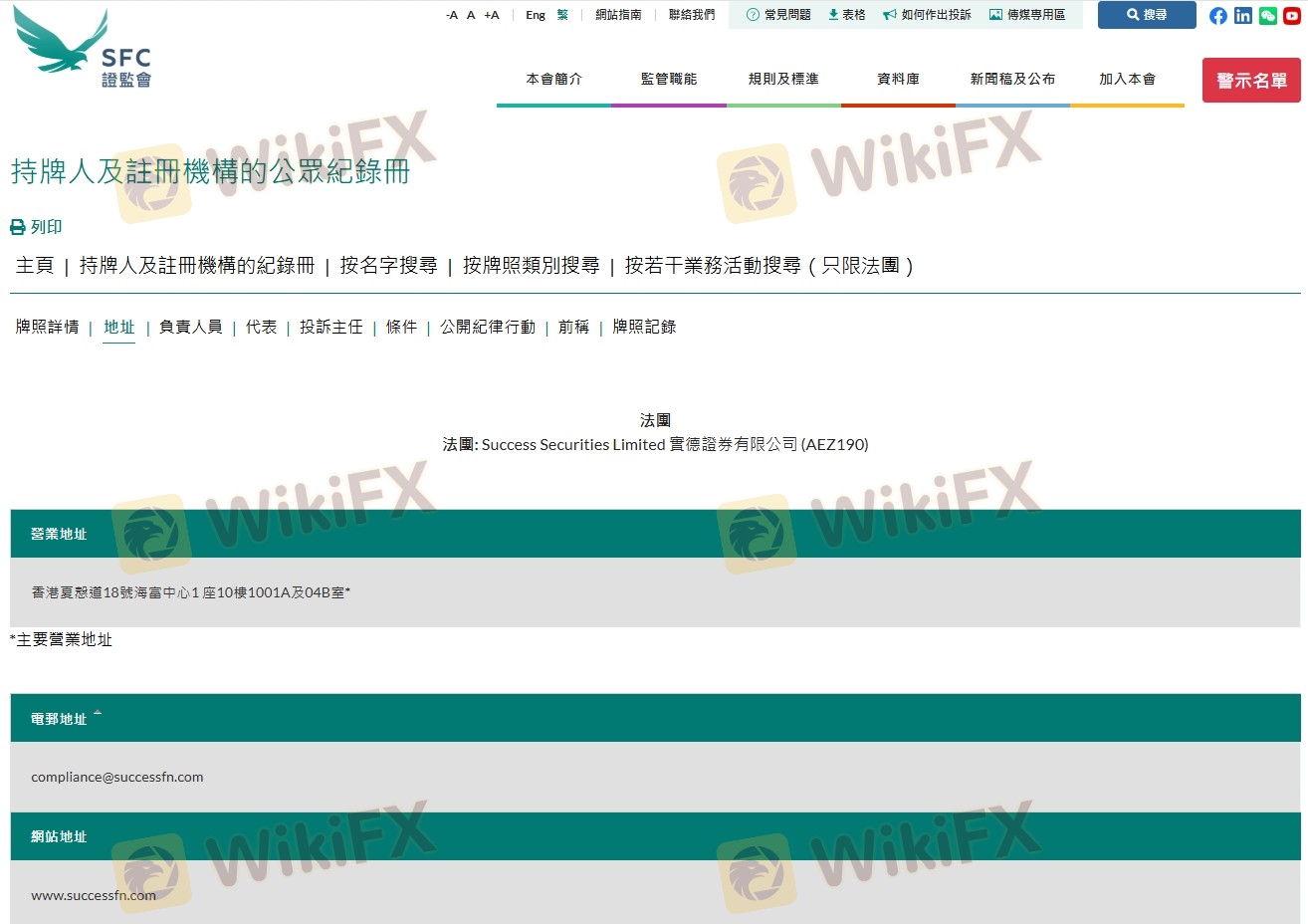 Mengenai legitimasi broker forex Success Finance, ia menyediakan Hong Kong HKGX, Hong Kong SFC, Hong Kong SFC, dan (Kami juga melakukan investigasi lapangan terkait aspek keamanan.).