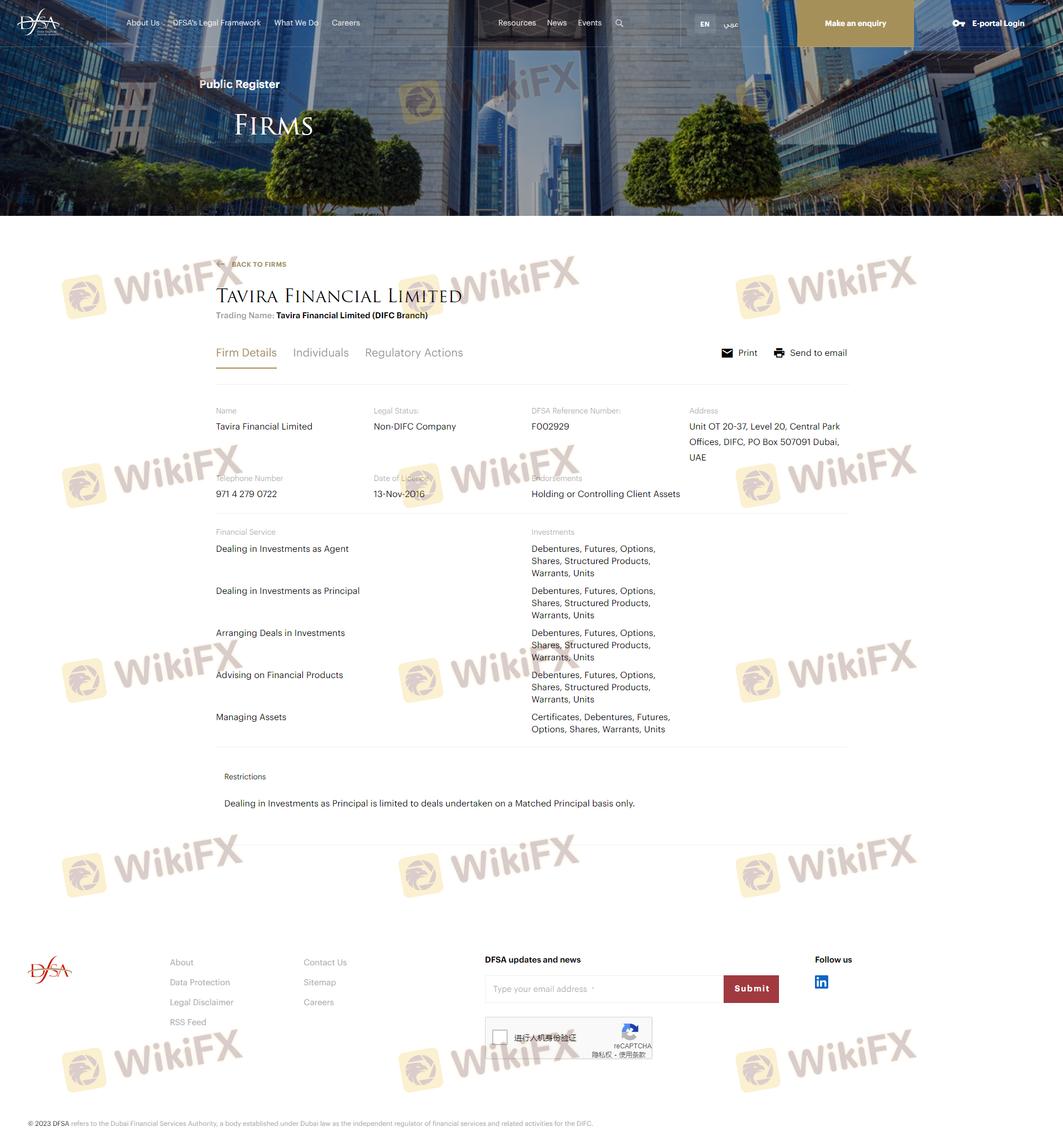 Mengenai legitimasi broker forex Tavira Securities, ia menyediakan Kerajaan Inggris FCA, Uni Emirat Arab DFSA, dan (Kami juga melakukan investigasi lapangan terkait aspek keamanan.).