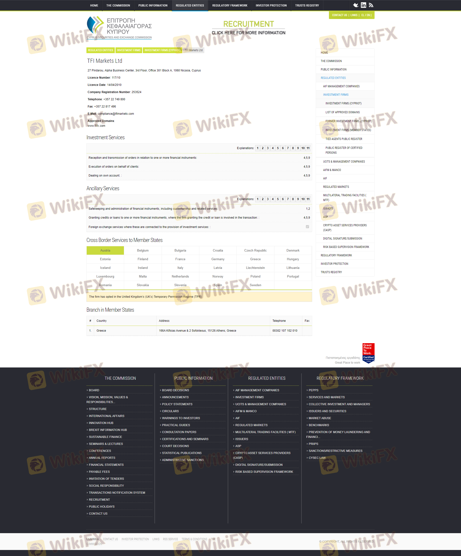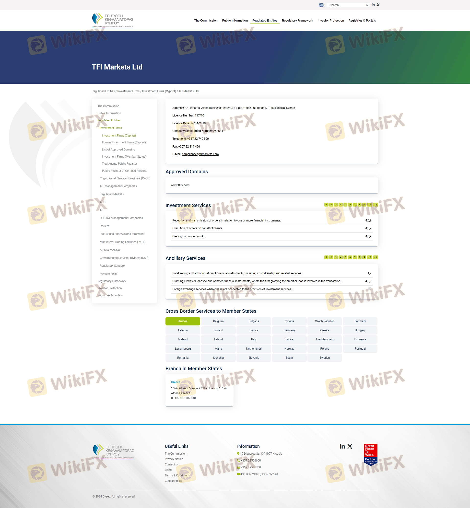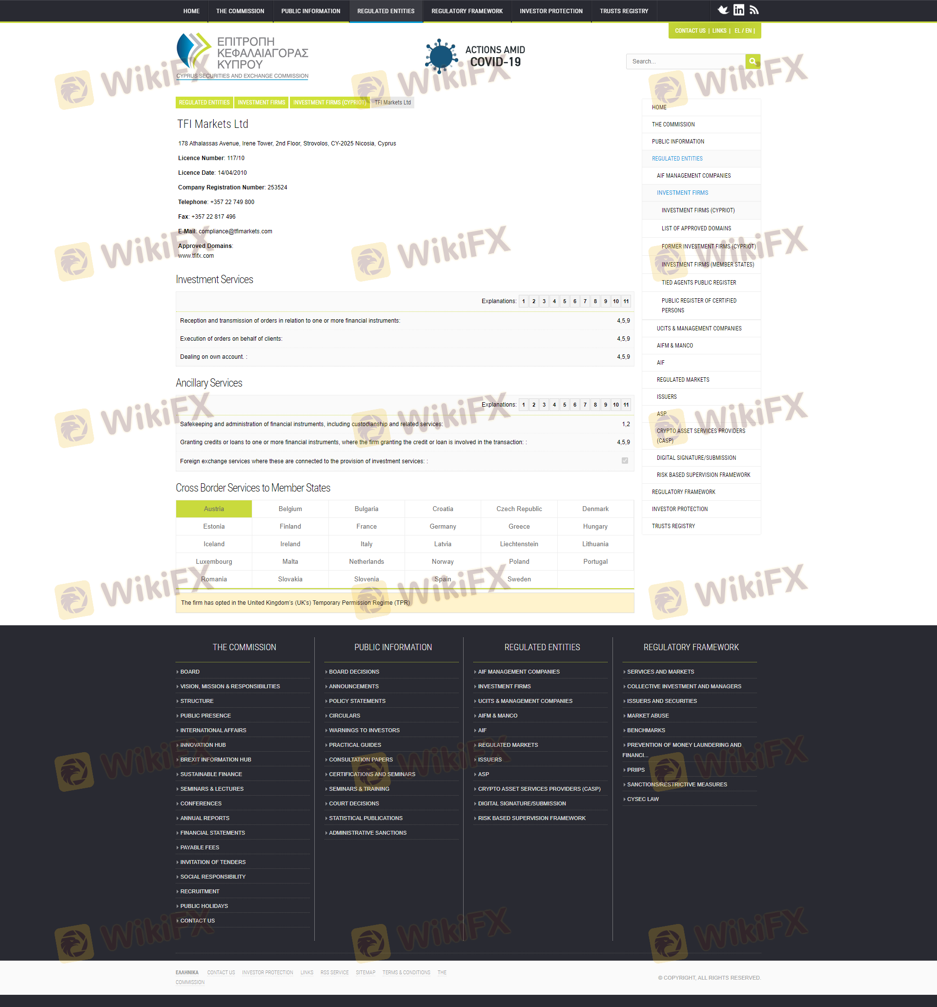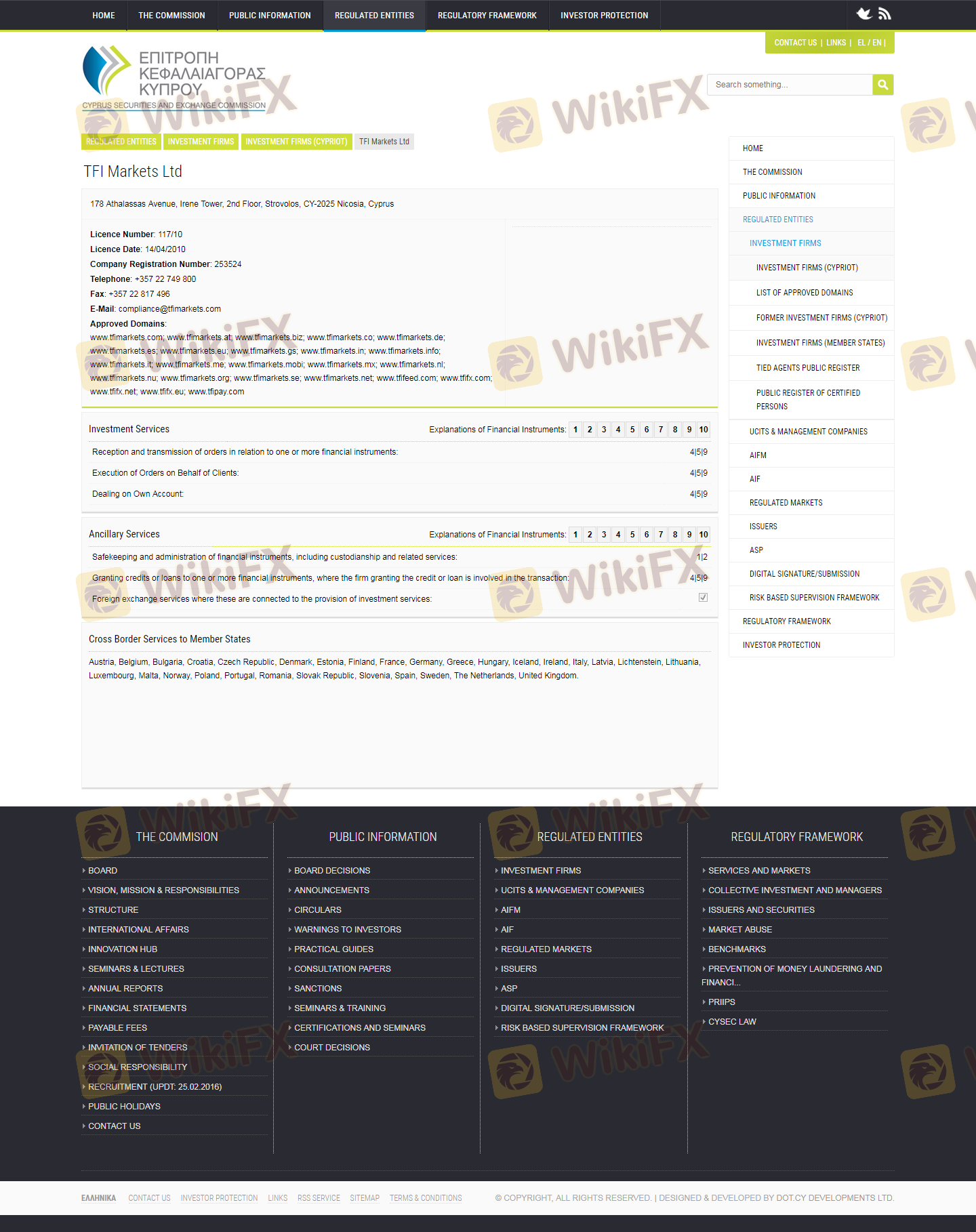 Regulasi adalah aspek kritis dari kredibilitas broker forex, karena memastikan bahwa broker mematuhi pedoman ketat yang dirancang untuk melindungi trader. TFIFX mengklaim bahwa mereka diatur oleh Cyprus Securities and Exchange Commission (CySEC), yang merupakan otoritas regulasi terkemuka dalam industri jasa keuangan. Berikut adalah ringkasan informasi regulasi utama: