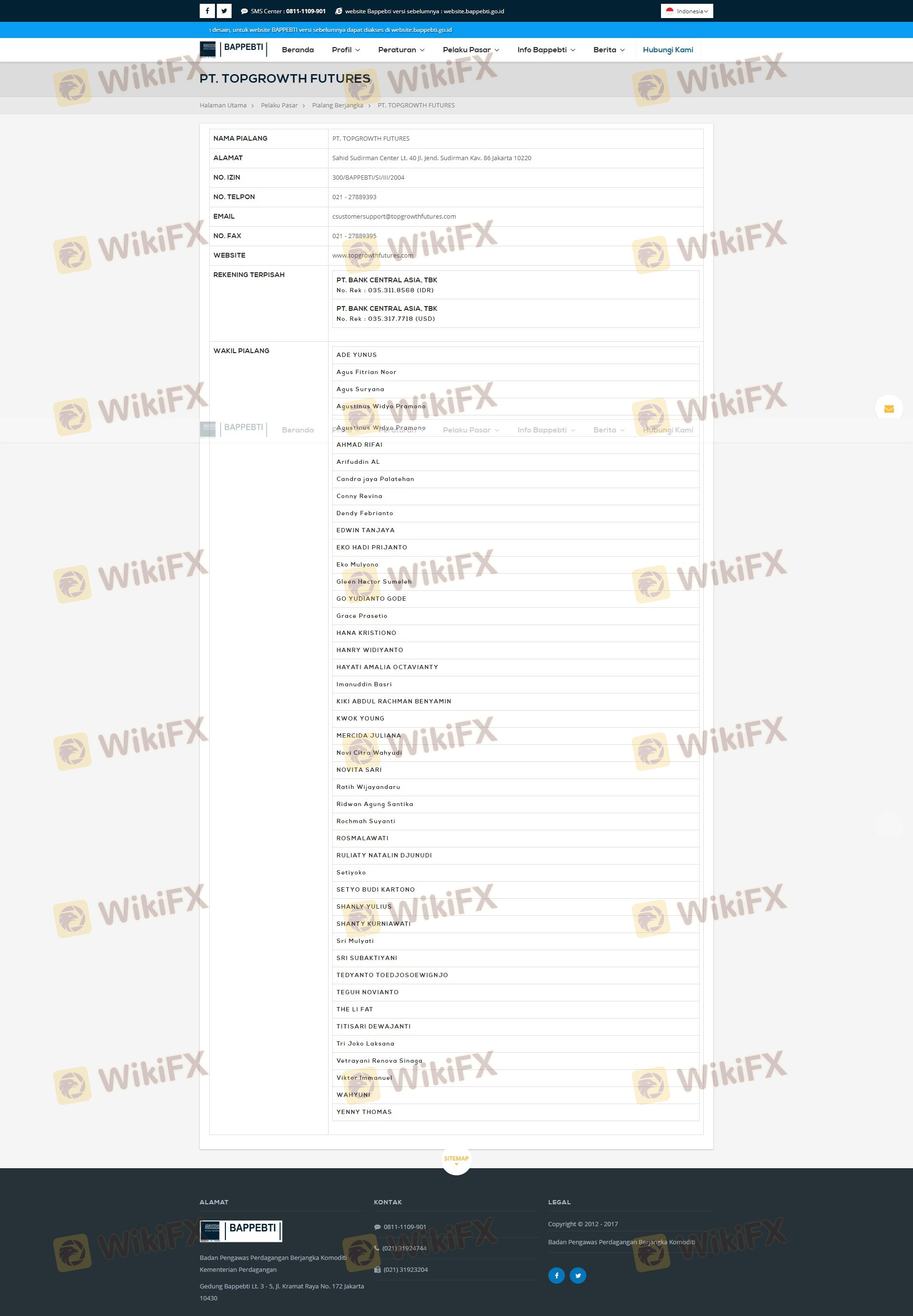 Mengenai legitimasi broker forex Topgrowth Futures, ia menyediakan Indonesia BAPPEBTI, dan (Kami juga melakukan investigasi lapangan terkait aspek keamanan.).