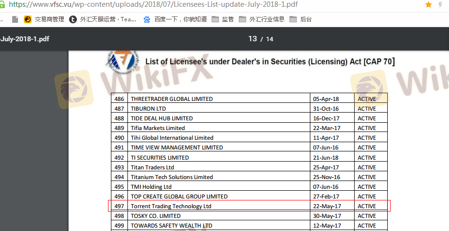 Status regulasi broker adalah penentu kritis dari legitimasi dan kepercayaannya. Dalam kasus Torrent, broker ini beroperasi di bawah naungan Vanuatu Financial Services Commission (VFSC). Namun, penting untuk dicatat bahwa lisensi Torrent telah dicabut, menimbulkan kekhawatiran signifikan tentang legitimasi operasionalnya. Ketidakhadiran pengawasan regulasi dapat mengekspos trader pada risiko penipuan dan praktik tidak etis lainnya. Berikut adalah ringkasan informasi regulasi Torrent:
