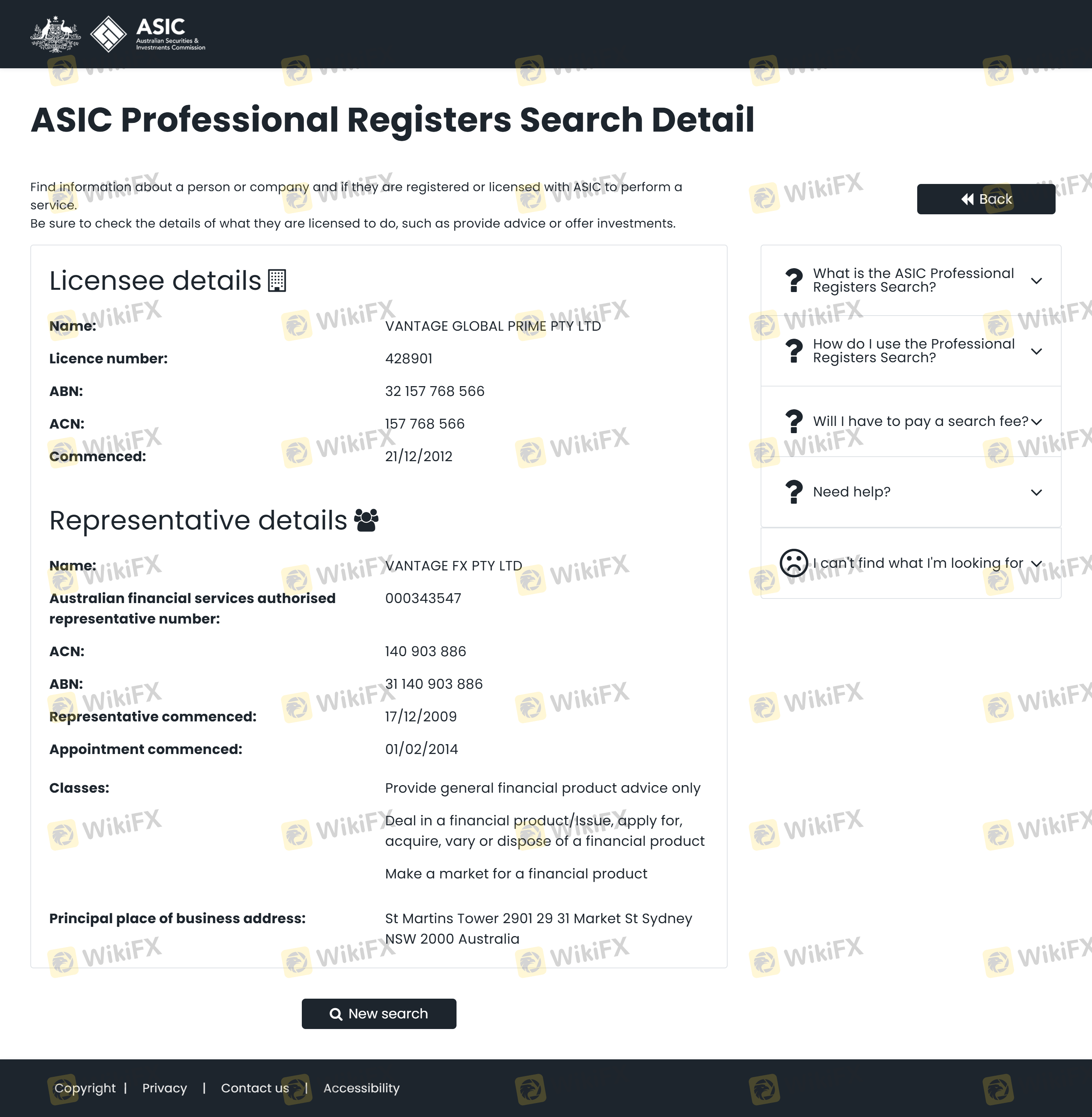 Mengenai legitimasi broker forex Vantage, ia menyediakan Australia ASIC, Kerajaan Inggris FCA, Afrika Selatan FSCA, Kepulauan Cayman CIMA, Australia ASIC, Vanuatu VFSC, dan (Kami juga melakukan investigasi lapangan terkait aspek keamanan.).