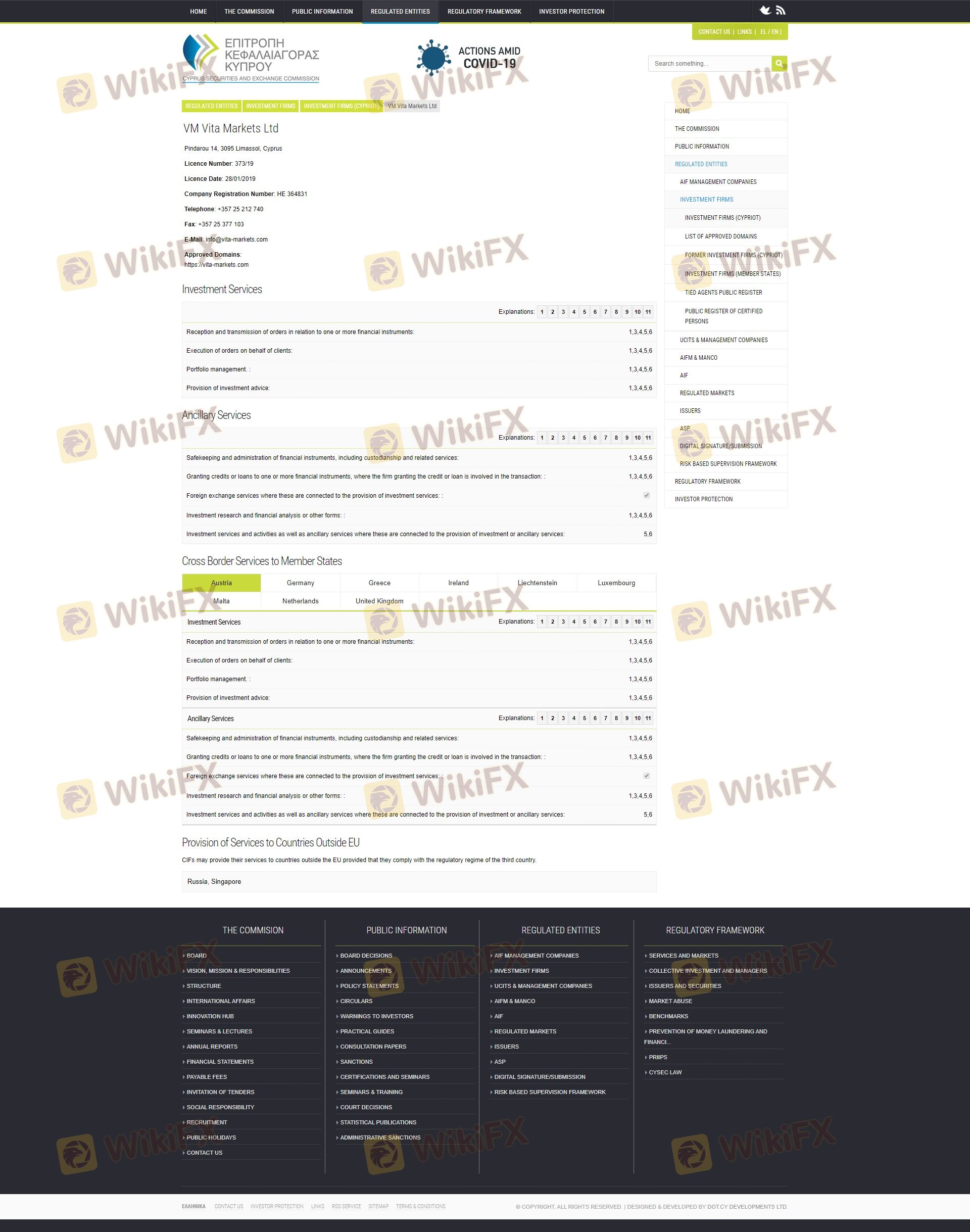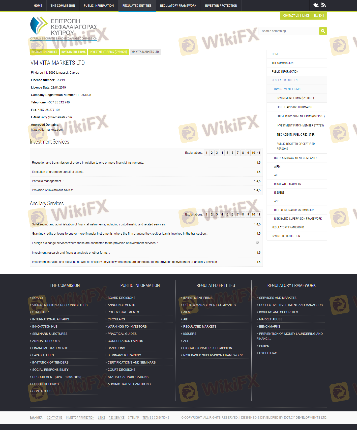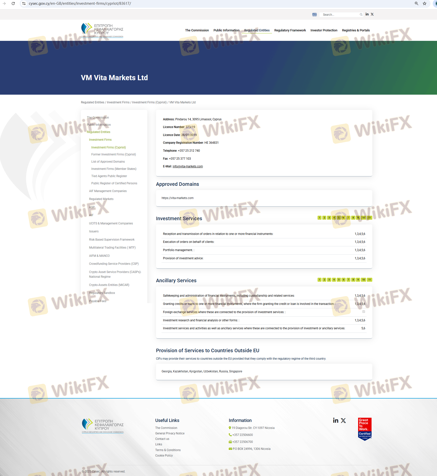 Mengenai legitimasi broker forex Vita Markets, ia menyediakan Siprus CYSEC, dan (Kami juga melakukan investigasi lapangan terkait aspek keamanan.).