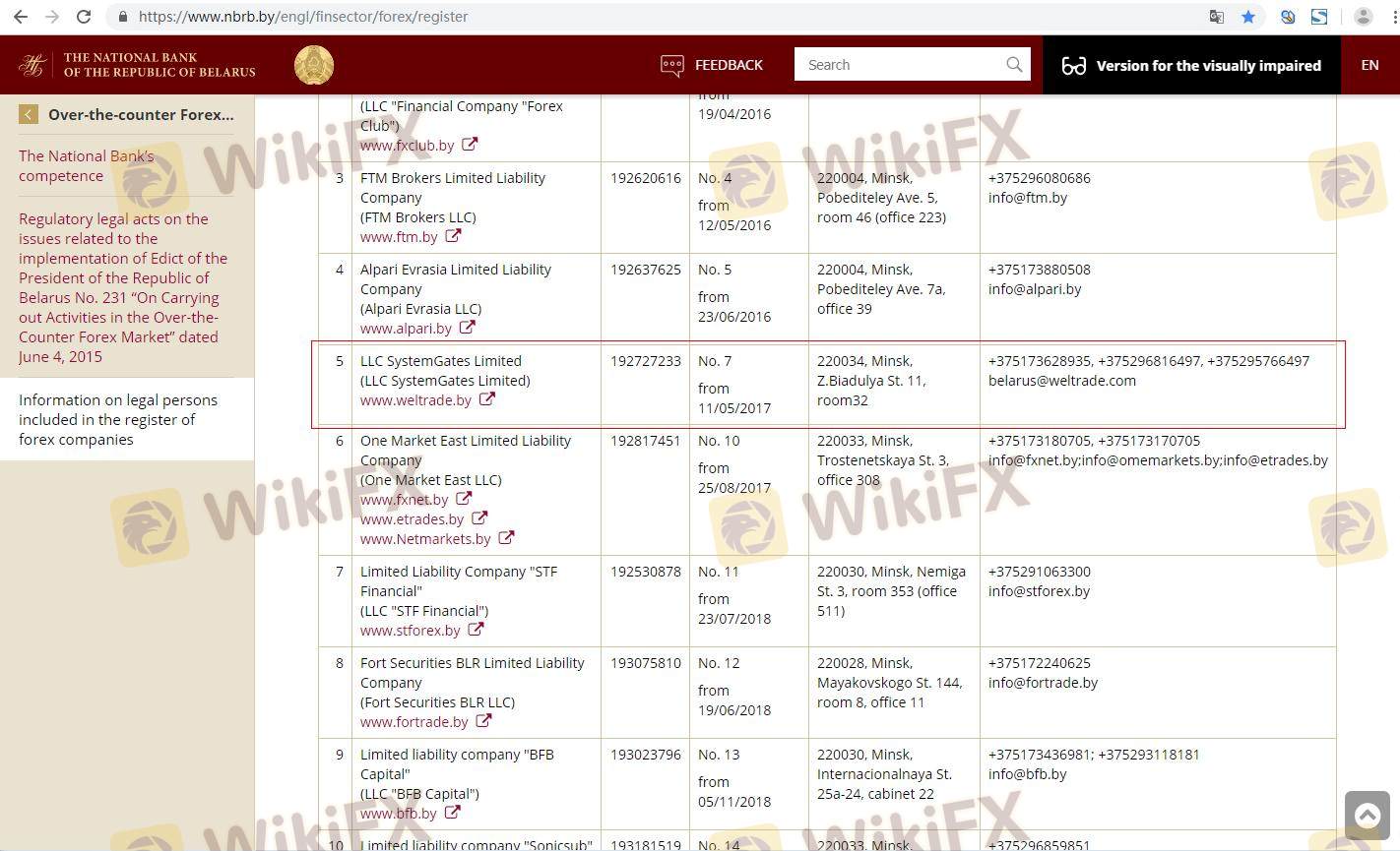 Mengenai legitimasi broker forex Weltrade, ia menyediakan Belarus NBRB, Afrika Selatan FSCA, dan (Kami juga melakukan investigasi lapangan terkait aspek keamanan.).