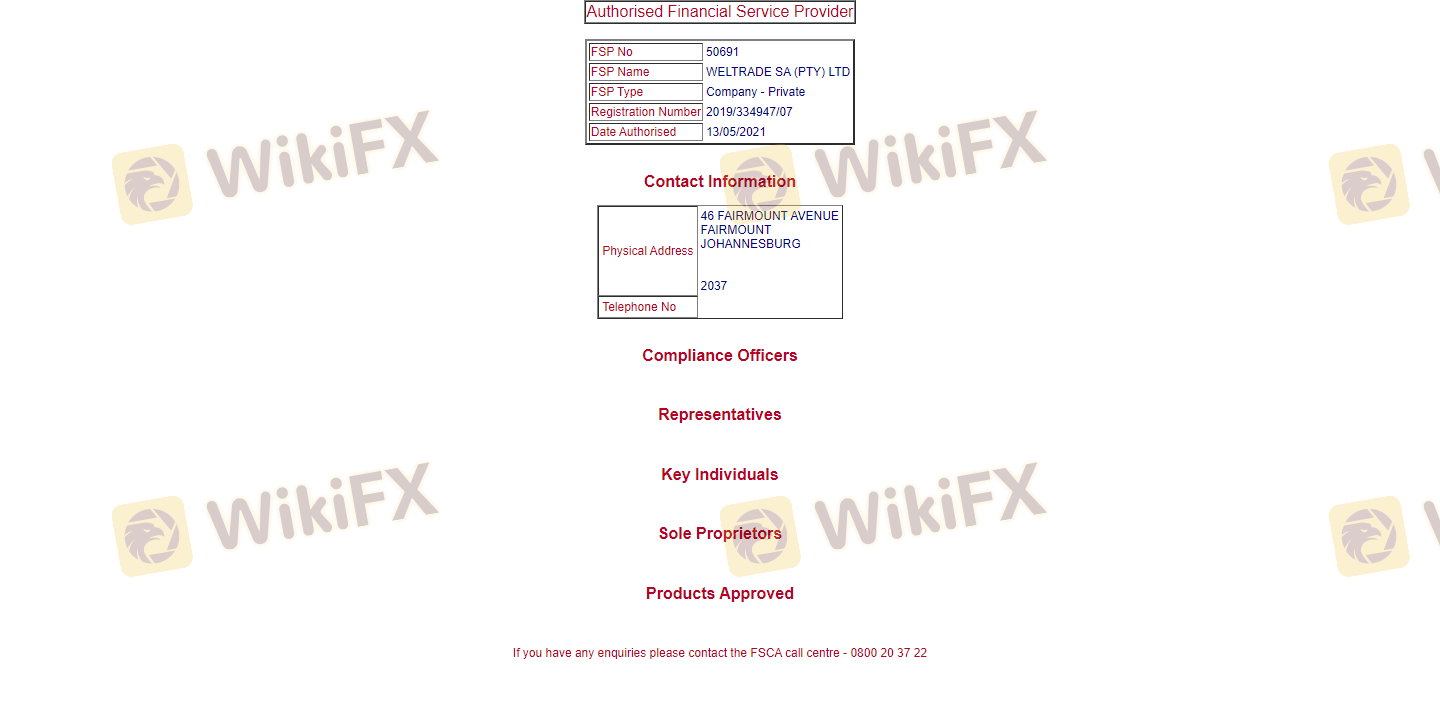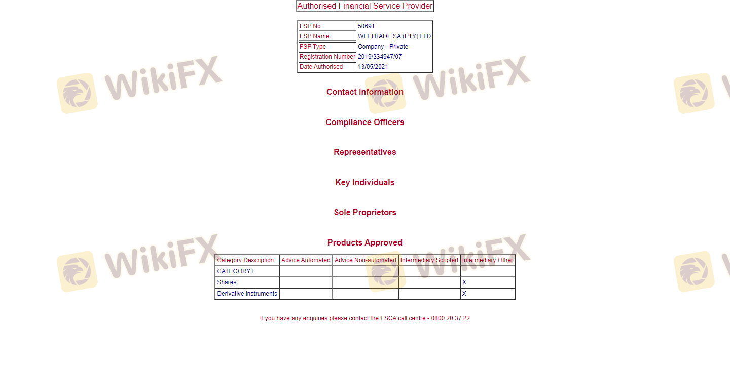 Status regulasi broker adalah faktor kritis dalam menilai legitimasinya. Weltrade beroperasi di bawah beberapa lisensi, terutama dari International Financial Services Commission (IFSC) di Belize dan Financial Sector Conduct Authority (FSCA) di Afrika Selatan. Berikut adalah ringkasan informasi regulasinya: