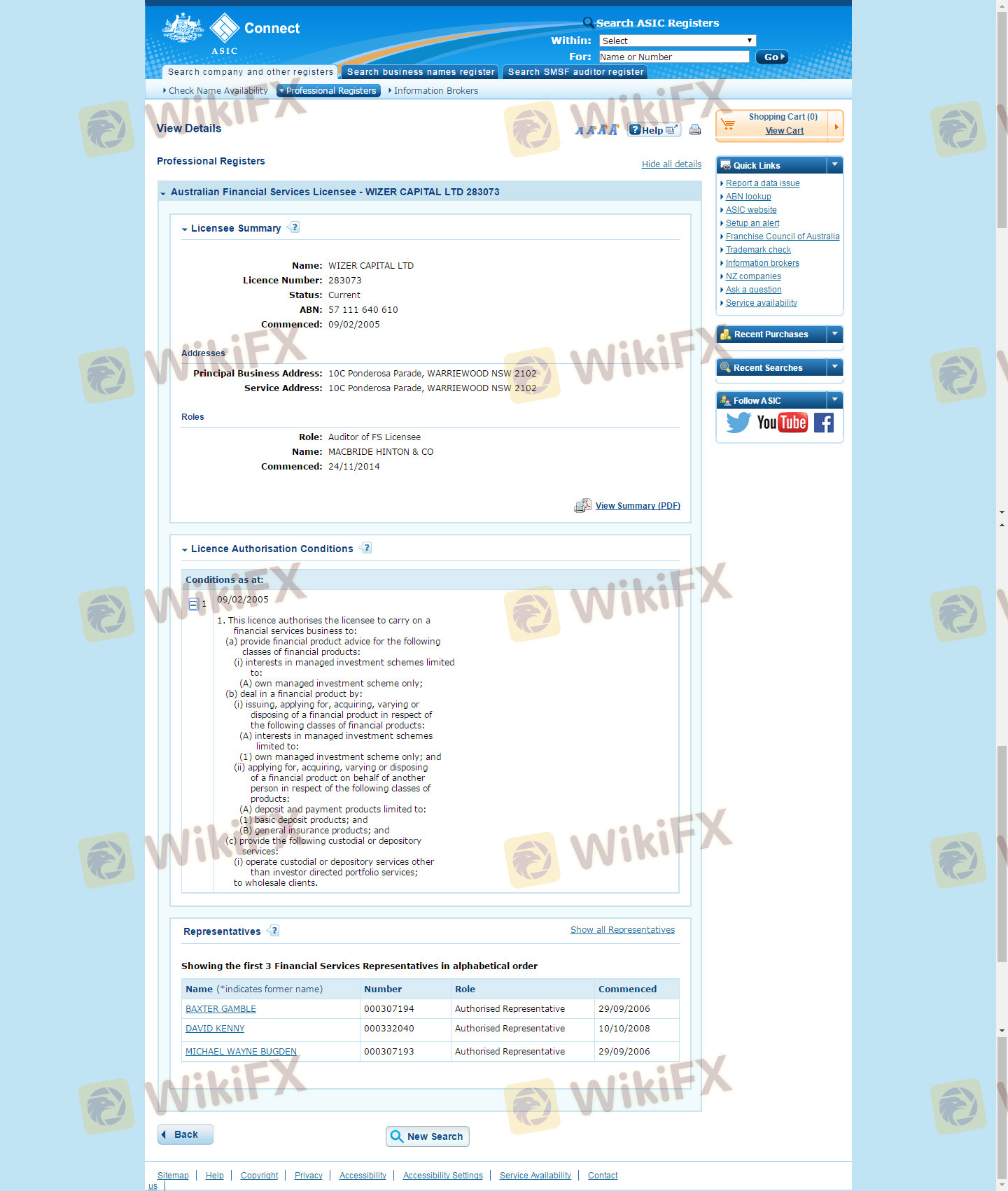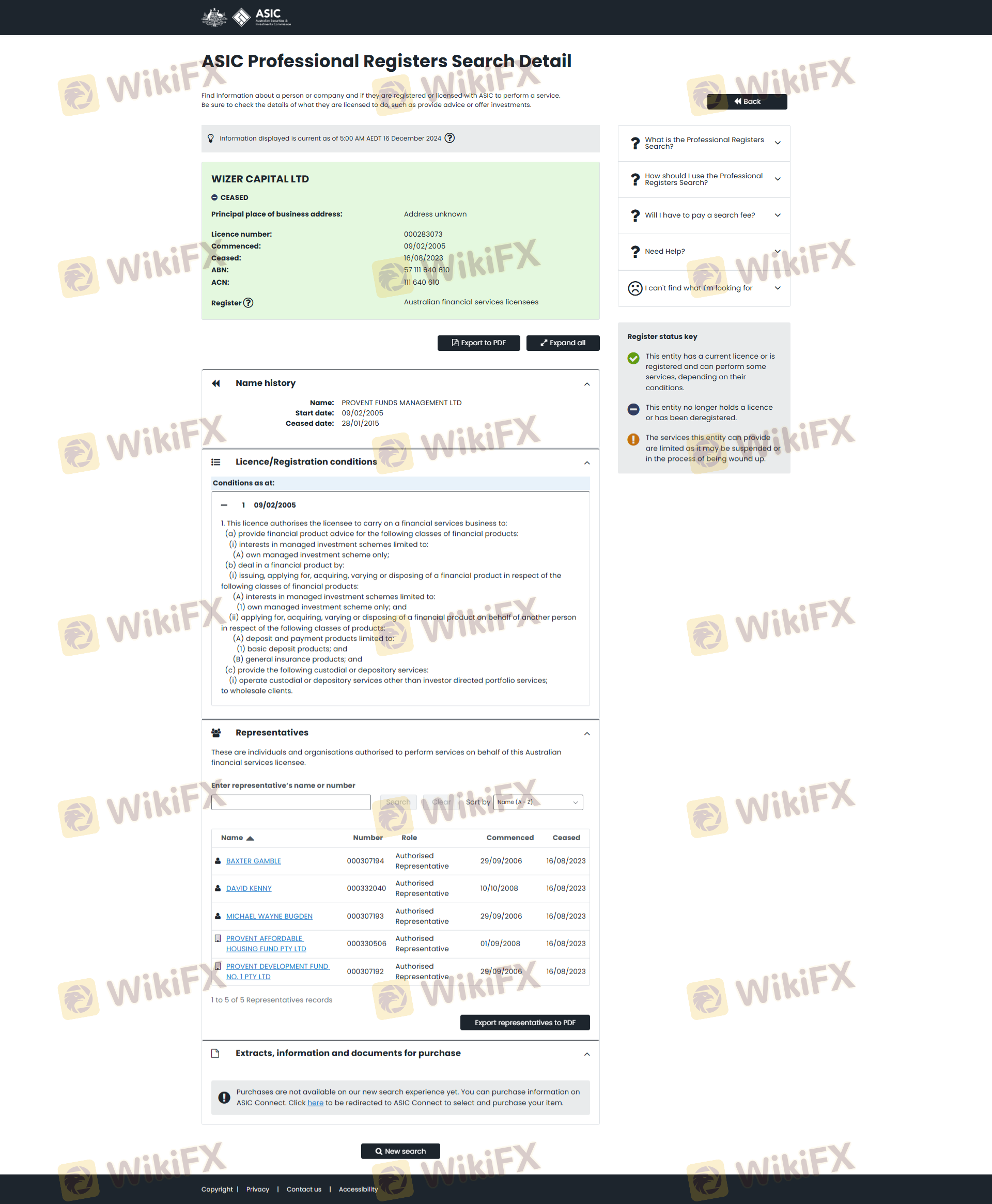 Status regulasi Wizer merupakan faktor kritis dalam menentukan legitimasinya sebagai broker forex. Regulasi broker oleh otoritas keuangan yang diakui memberikan lapisan perlindungan bagi trader, memastikan bahwa broker mematuhi standar perilaku dan praktik keuangan tertentu. Menurut temuan kami, Wizer terdaftar di bawah otoritas regulasi Australian Securities and Investments Commission (ASIC).