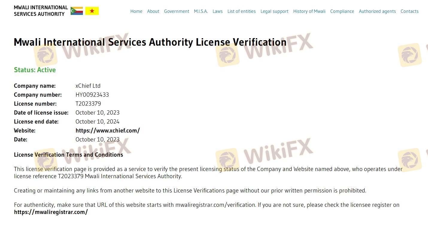Lingkungan regulasi di mana broker beroperasi merupakan faktor penentu utama legitimasi dan kepercayaannya. xChief diatur oleh Mwali International Services Authority (MISA) di Komoro dan Vanuatu Financial Services Commission (VFSC). Meskipun badan regulasi ini memberikan tingkat pengawasan tertentu, mereka tidak dianggap sebagai regulator tingkat satu, yang biasanya mencakup otoritas seperti Financial Conduct Authority (FCA) di Inggris atau Australian Securities and Investments Commission (ASIC). Hal ini menimbulkan kekhawatiran mengenai ketangguhan kerangka regulasi yang mengatur xChief.
