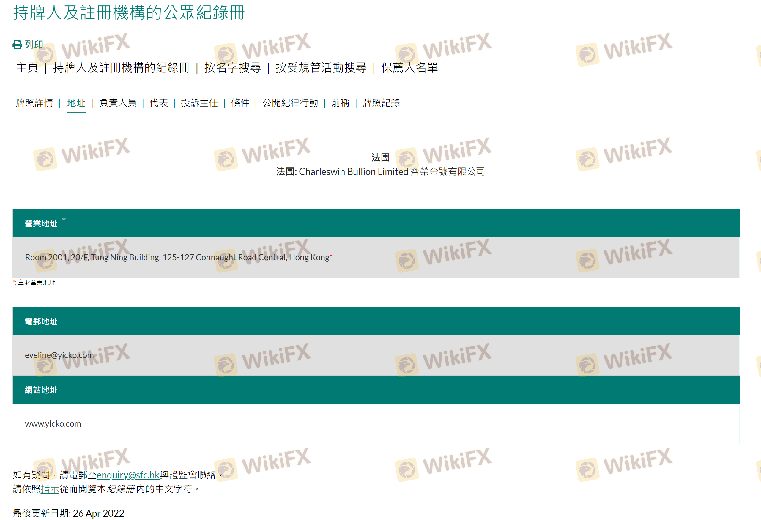 Mengenai legitimasi broker forex Yicko Securities, ia menyediakan Hong Kong SFC, dan (Kami juga melakukan investigasi lapangan terkait aspek keamanan.).