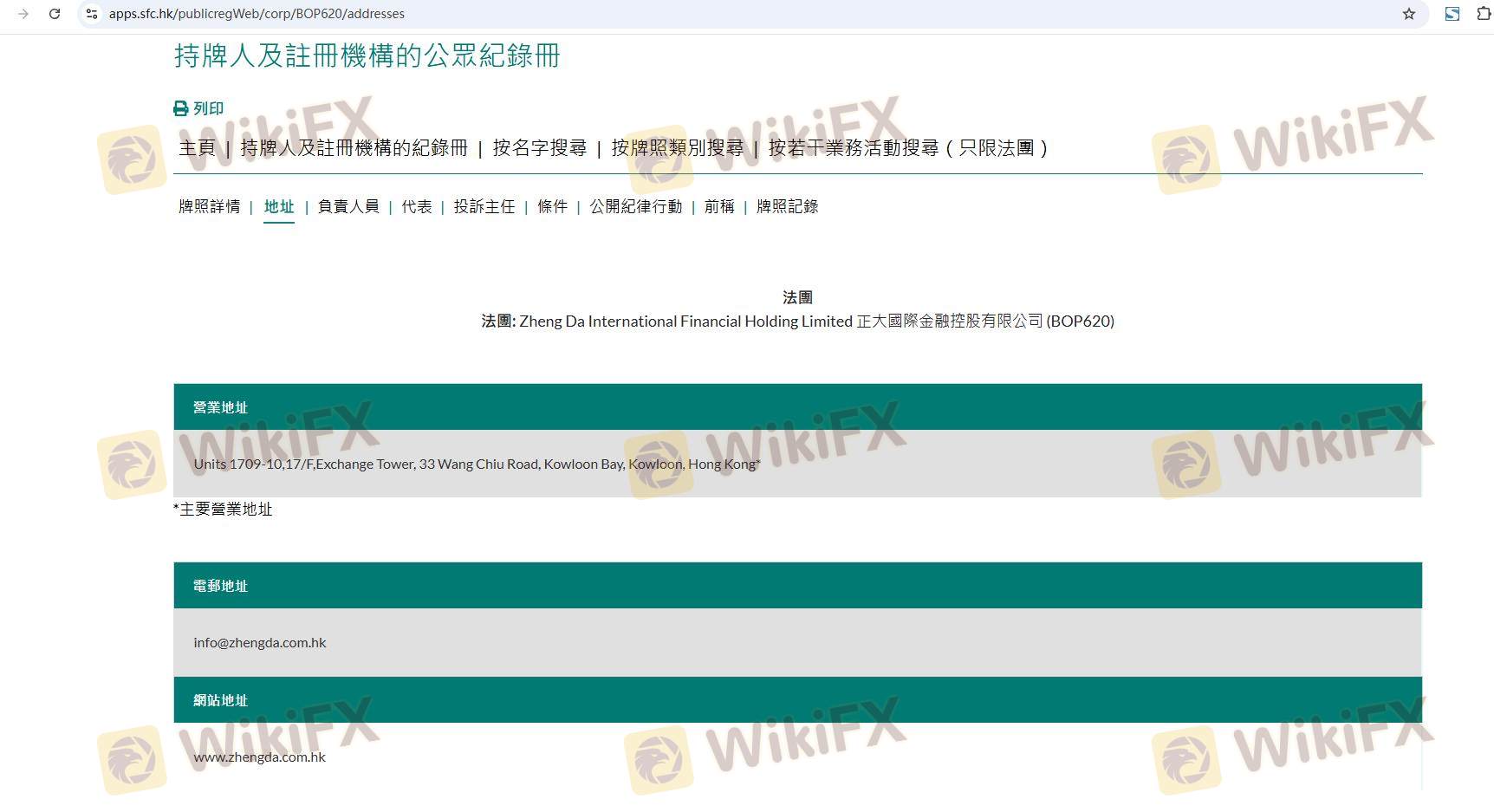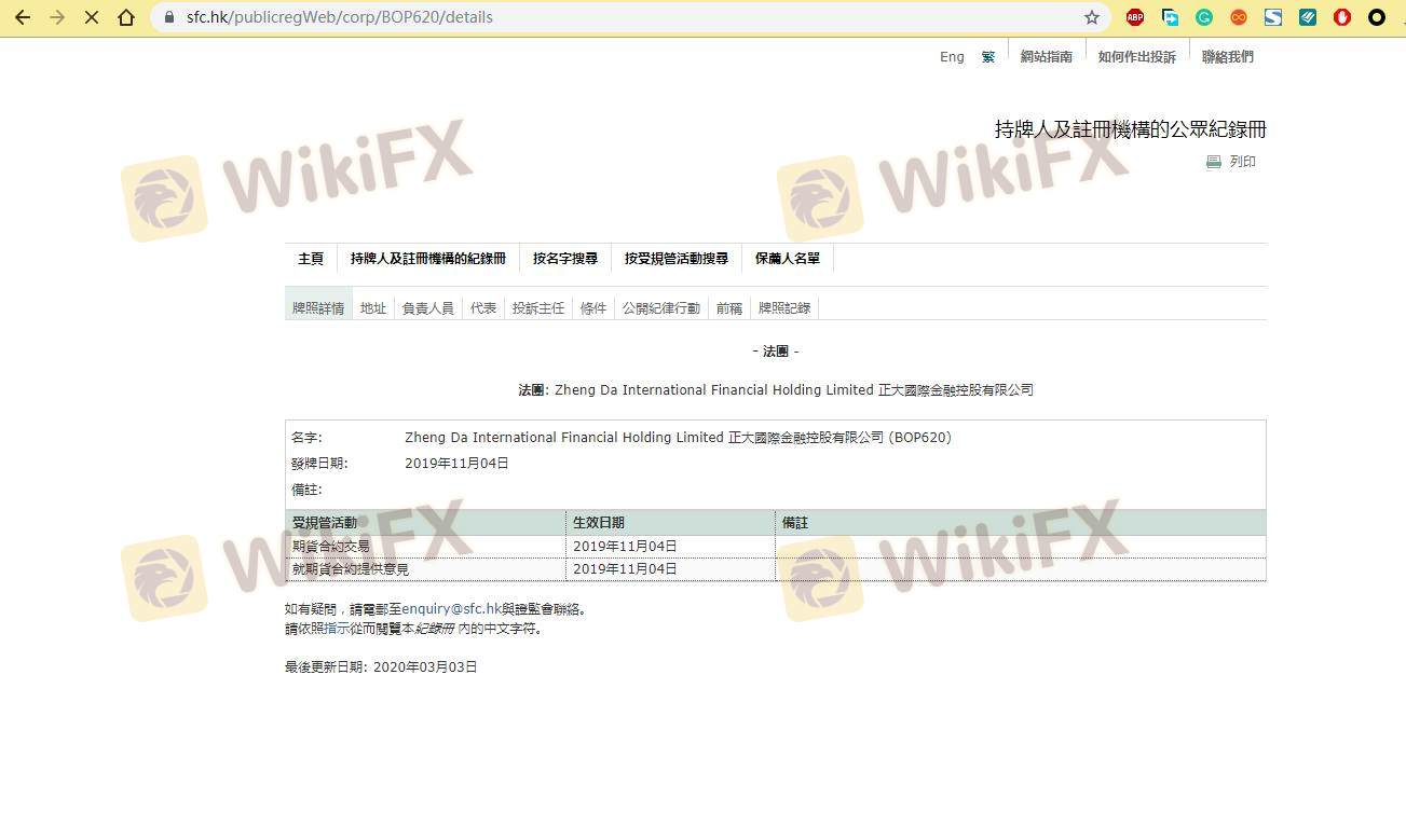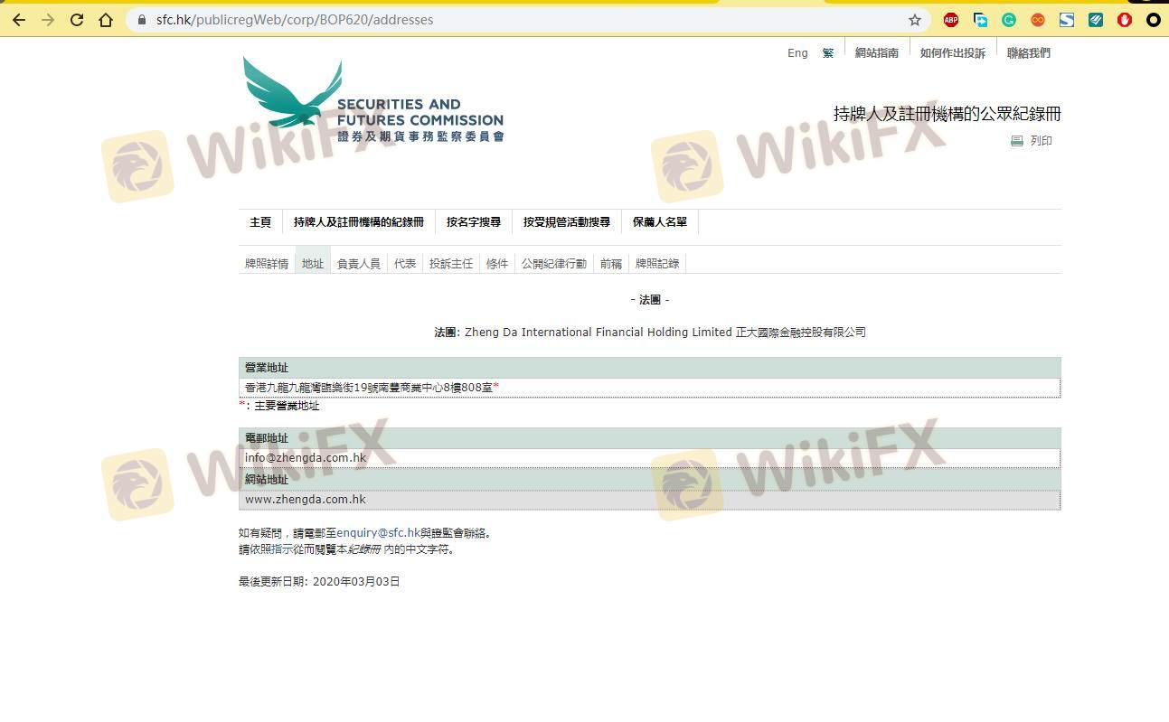 Mengenai legitimasi broker forex ZHENG DA INTERNATIONAL, ia menyediakan Hong Kong SFC, dan (Kami juga melakukan investigasi lapangan terkait aspek keamanan.).