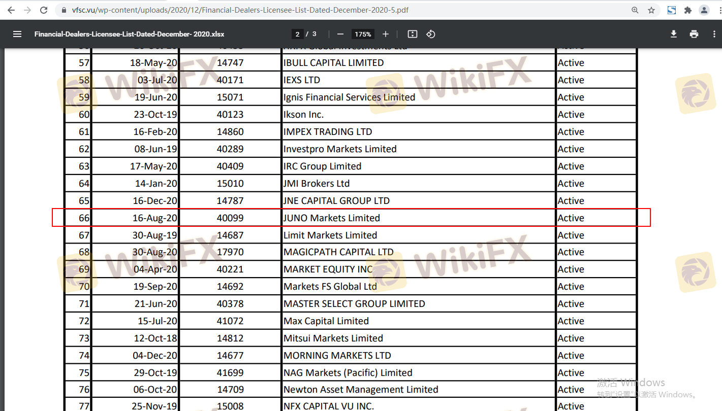 Регуляторная структура, управляющая брокером, является решающим фактором его легитимности и надежности. Juno Markets регулируется Комиссией по финансовым услугам Вануату (VFSC), которая известна своим относительно мягким регуляторным режимом по сравнению с более строгими юрисдикциями, такими как британская FCA или австралийская ASIC. В следующей таблице приведены основные регуляторные данные по Juno Markets: