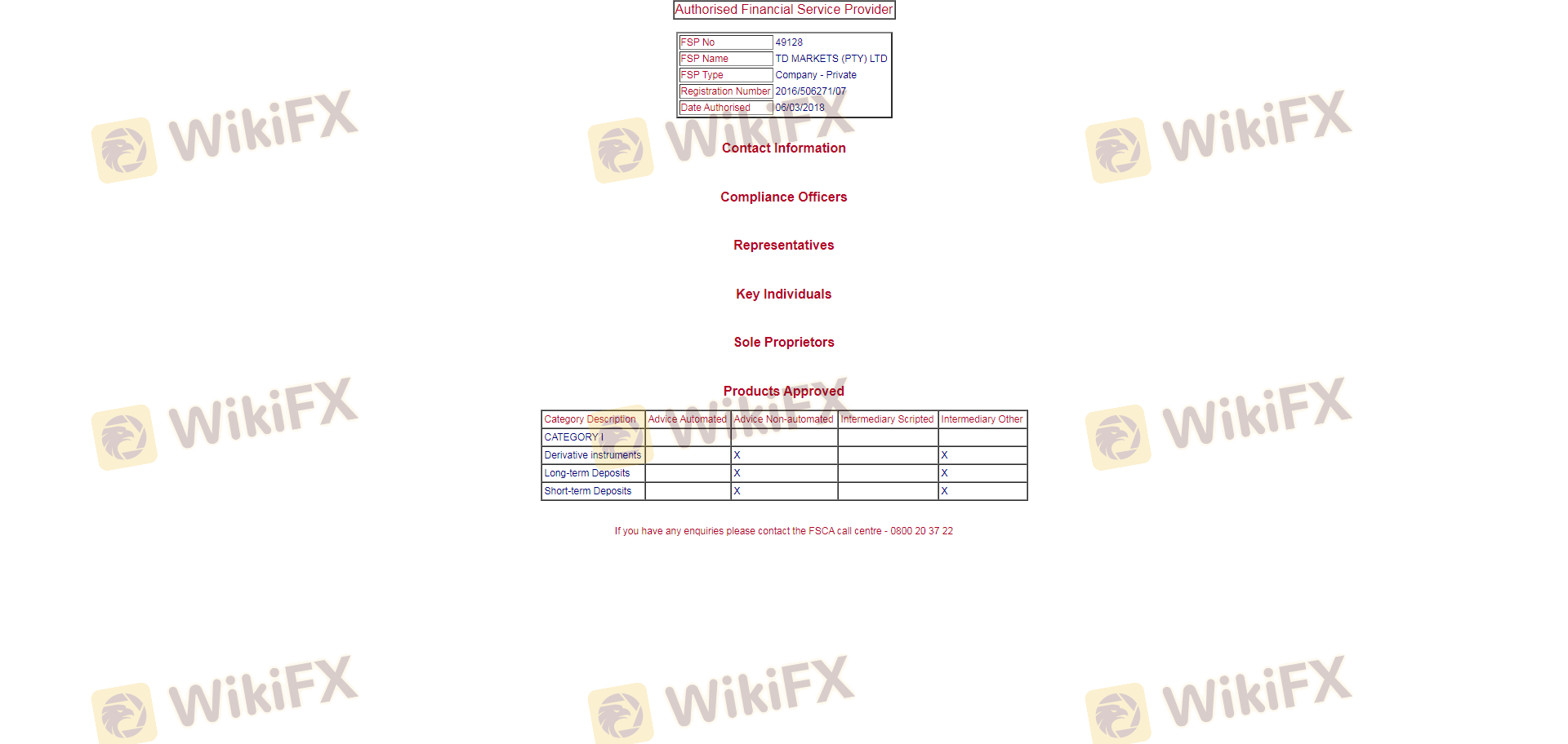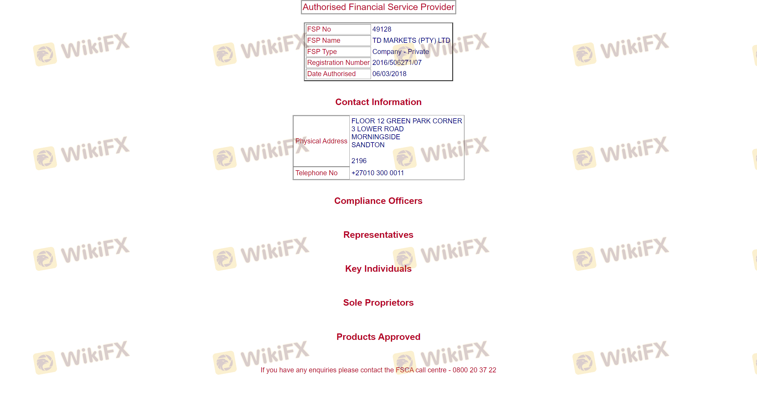 Регуляторный статус брокера является критическим фактором для определения его безопасности и надежности. TD Markets заявляет, что регулируется Управлением по надзору за финансовым сектором (FSCA) в Южной Африке, которое известно своими строгими стандартами соответствия. Однако существуют опасения относительно достоверности этого заявления, поскольку некоторые источники указывают, что TD Markets работает по офшорной лицензии от Управления финансовых услуг Сент-Винсента и Гренадин, которое часто рассматривается как менее авторитетная регуляторная система.