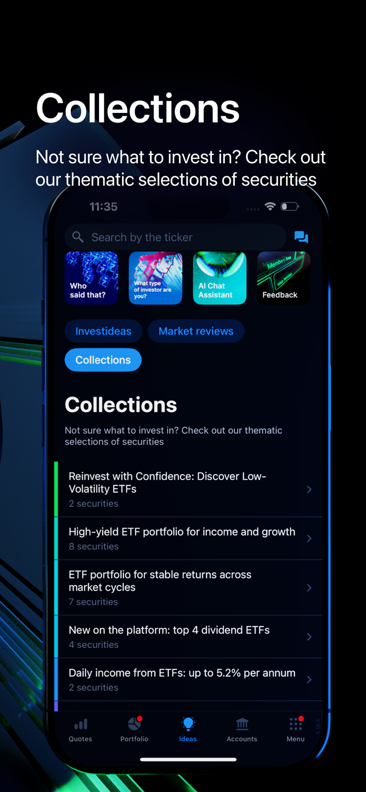 - การเทรดสินทรัพย์หลากหลายประเภท: เทรดสินทรัพย์หลากหลายประเภท รวมถึงหุ้น, ETFs, และออปชัน