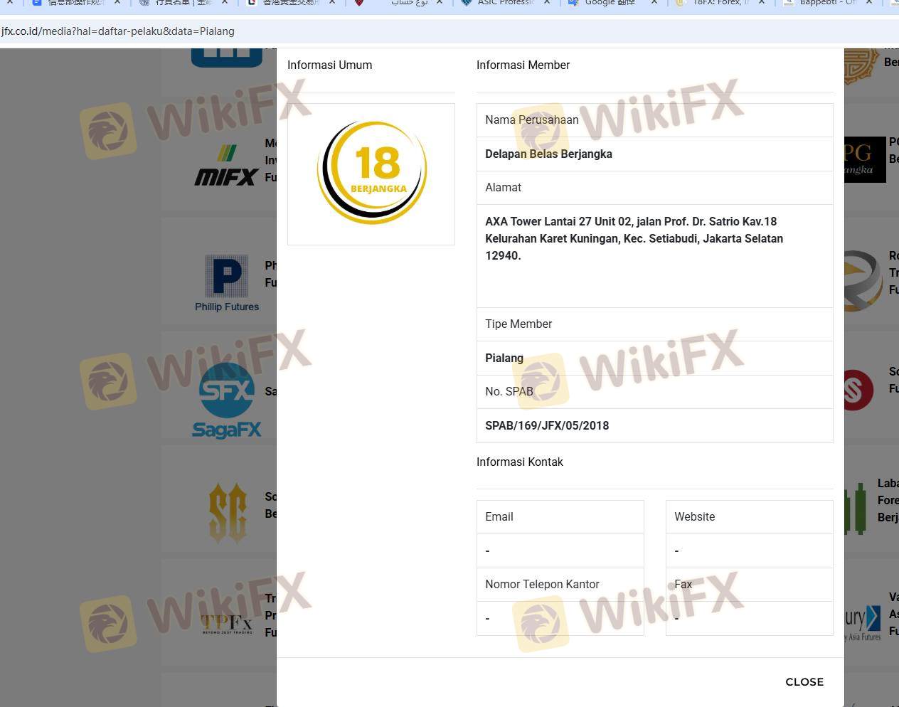 เกี่ยวกับความถูกต้องตามกฎหมายของโบรกเกอร์ฟอเร็กซ์ 18FX ทางบริษัทได้มีการจัดเตรียม อินโดนีเซีย BAPPEBTI, อินโดนีเซีย JFX และ