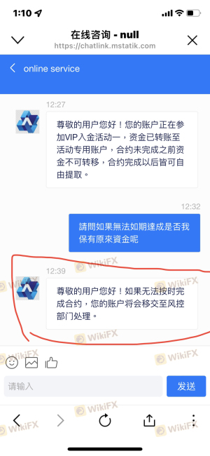 ฉันพบและพูดคุยกันบนอินเทอร์เน็ต และทำให้ฉันดำเนินการซื้อขายทองคำล่วงหน้า xauusd.a เพื่อทำเงินทุกวัน หลังจากลงทุนไปสองสามครั้ง ฉันต้องการถอนทองคำ ฉันยังผ่านอินเทอร์เน็ตและสมัครสำเร็จ แต่ผ่านไปสองสามชั่วโมงและไม่ได้รับบัญชีธนาคาร เพื่อเงิน คนที่พาฉันไปที่การผ่าตัดปรากฏตัวและถามฉันว่าฉันได้รับการแจ้งเตือนจากฝ่ายบริการลูกค้าสำหรับกิจกรรมโบนัสหรือไม่ ฉันตอบว่าไม่ และให้ฉันขอให้ฝ่ายบริการลูกค้าขอให้ฉันเข้าร่วม หลังจากที่ฉันตัดสินใจเข้าร่วม การถอนเงินที่ฉันสมัครสำเร็จภายใน 3 นาทีได้ถูกยกเลิก ถามฝ่ายบริการลูกค้าและบอกว่าเพื่อป้องกันไม่ให้สมาชิกถอนเงินรางวัลอย่างมีเจตนา การถอนจะถูกจำกัดจนกว่ากิจกรรมจะเสร็จสิ้น ไม่สามารถยกเลิกได้ คุณสามารถถอนเงินได้จนกว่ากิจกรรมจะเสร็จสิ้น หากเกินเวลากิจกรรม หากกิจกรรมไม่เสร็จสิ้น จะถูกหัก 5% ทุกวันจนกว่ากิจกรรมจะเสร็จสิ้น อันที่จริงพวกเขาไม่สามารถถอนเงินได้ในตอนแรก