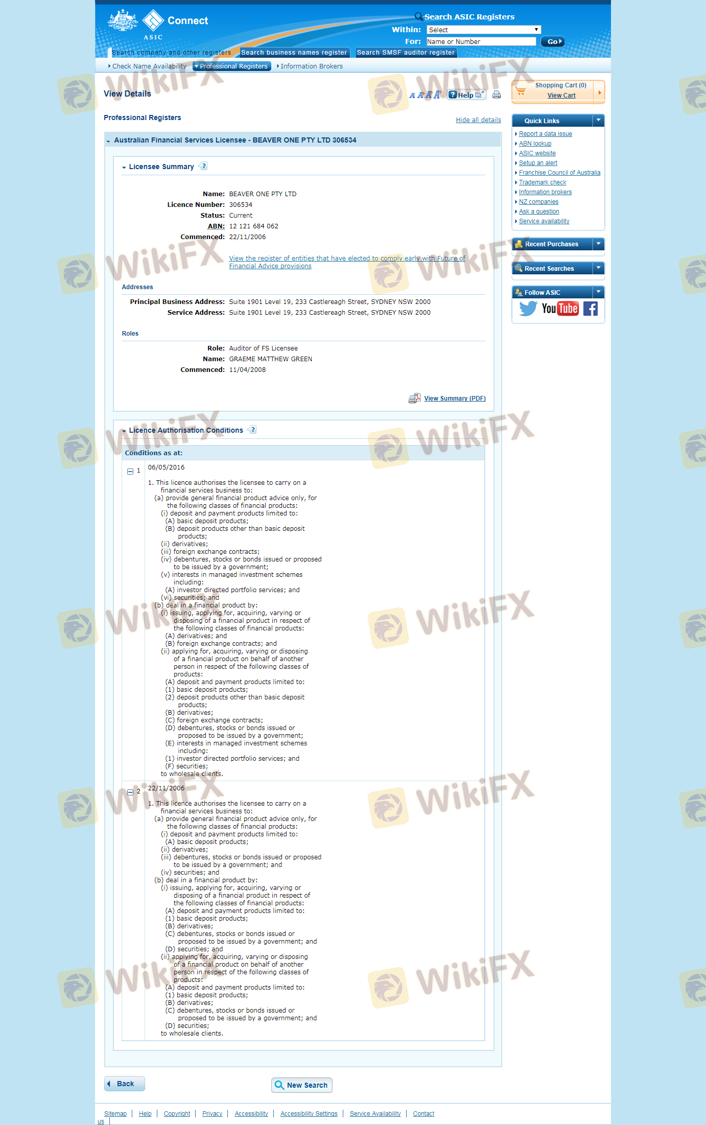 เกี่ยวกับความถูกต้องตามกฎหมายของโบรกเกอร์ฟอเร็กซ์ BEAVER ONE ทางบริษัทได้มีการจัดเตรียม ออสเตรเลีย ASIC และ (ยังมีการสำรวจภาคสนามเกี่ยวกับความปลอดภัย)