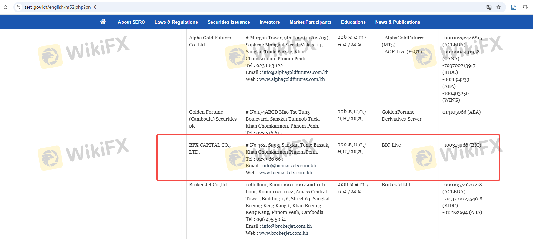 เกี่ยวกับความถูกต้องตามกฎหมายของโบรกเกอร์ฟอเร็กซ์ BIC Markets ทางบริษัทได้มีการจัดเตรียม ประเทศกัมพูชา SERC และ (ยังมีการสำรวจภาคสนามเกี่ยวกับความปลอดภัย)