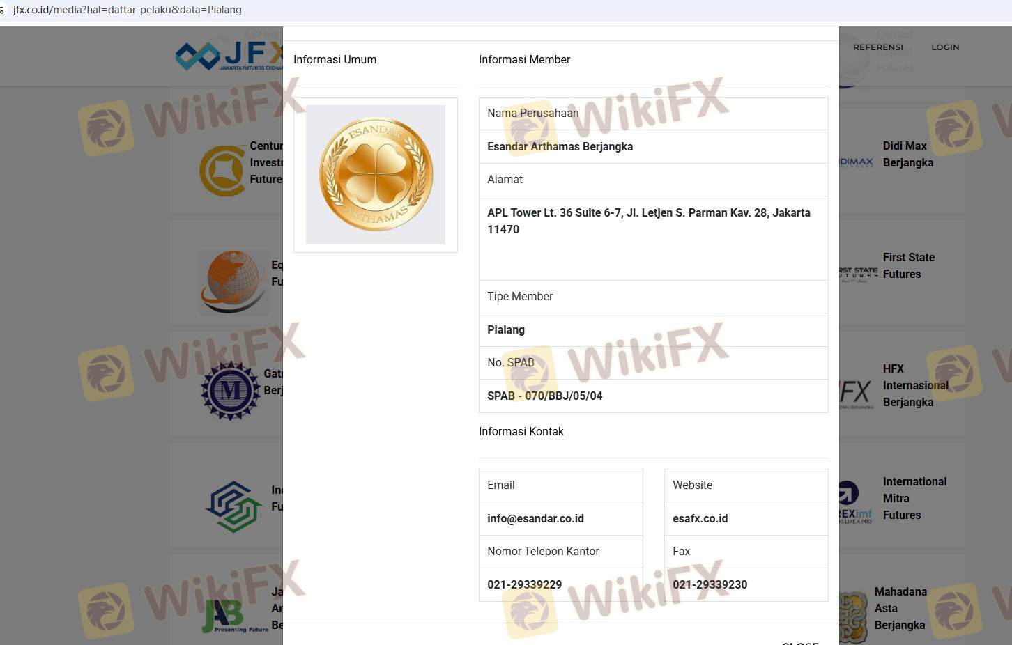 เกี่ยวกับความถูกต้องตามกฎหมายของโบรกเกอร์ฟอเร็กซ์ esaFX ทางบริษัทได้มีการจัดเตรียม อินโดนีเซีย BAPPEBTI, อินโดนีเซีย JFX และ