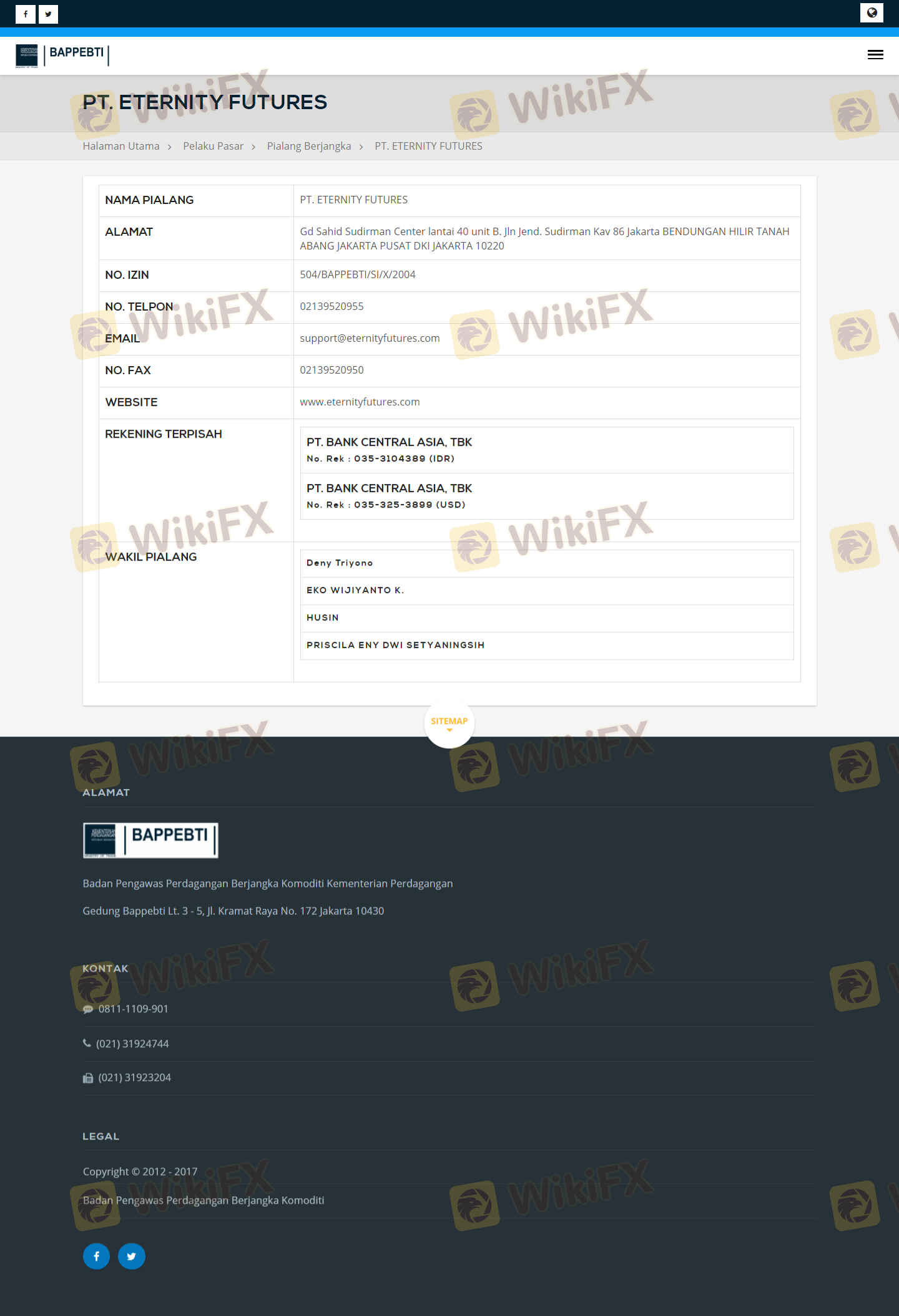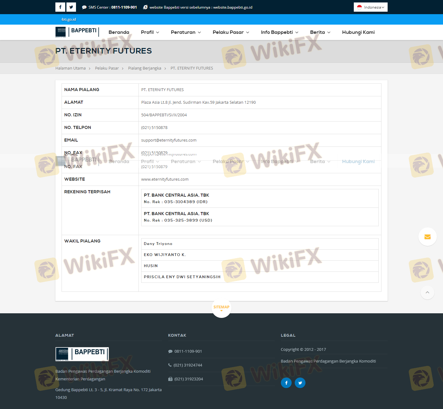 เกี่ยวกับความถูกต้องตามกฎหมายของโบรกเกอร์ฟอเร็กซ์ Eternity Futures ทางบริษัทได้มีการจัดเตรียม อินโดนีเซีย BAPPEBTI และ (ยังมีการสำรวจภาคสนามเกี่ยวกับความปลอดภัย)