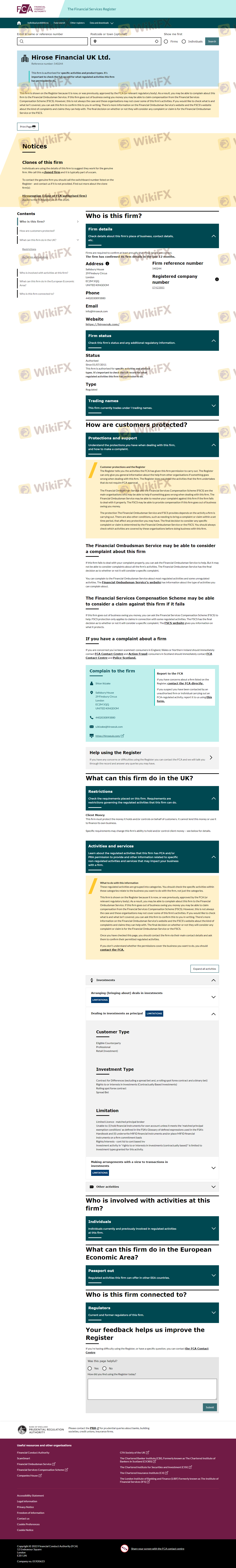 สาขาสหราชอาณาจักรของฮิโรเสะ ไฟแนนเชียล อยู่ภายใต้การกำกับดูแลของ FCA ซึ่งกำหนดให้บริษัทต้องรักษาบัญชีแยกสำหรับเงินทุนของลูกค้าและปฏิบัติตามมาตรฐานการดำเนินงานที่เข้มงวด กรอบการกำกับดูแลนี้ให้ความปลอดภัยสำหรับเทรดเดอร์ เนื่องจากพวกเขาได้รับการคุ้มครองภายใต้ Financial Services Compensation Scheme (FSCS) ซึ่งคุ้มครองลูกค้าในกรณีที่บริษัทล้มละลายสูงถึง 85,000 ปอนด์ อย่างไรก็ตาม สิ่งสำคัญที่ควรทราบคือ ในขณะที่การดำเนินงานในสหราชอาณาจักรและมาเลเซียได้รับการกำกับดูแลอย่างดี กิจการในญี่ปุ่นถูกตั้งธงว่าเป็นโคลนที่น่าสงสัย ซึ่งทำให้เกิดความกังวลเกี่ยวกับความถูกต้องตามกฎหมาย