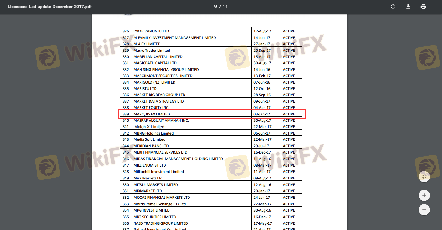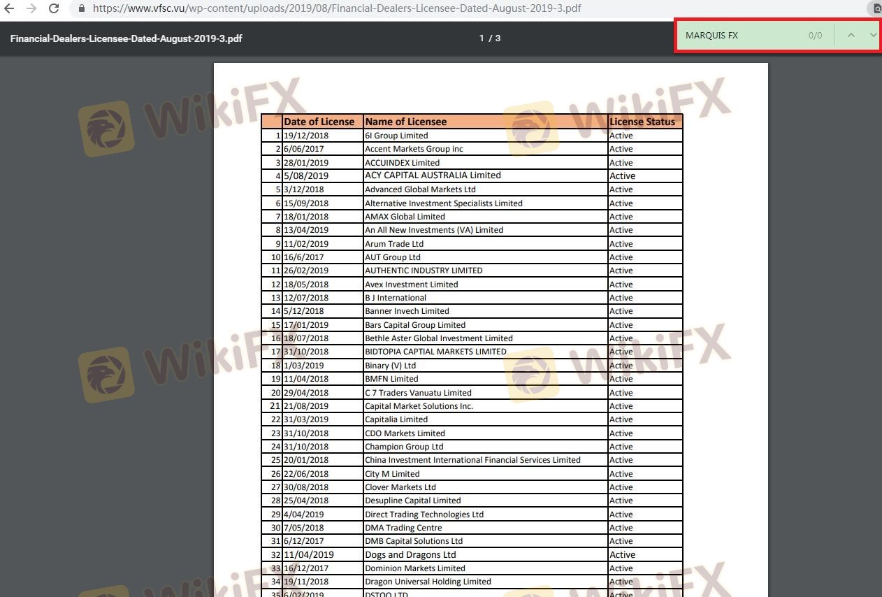 เกี่ยวกับความถูกต้องตามกฎหมายของโบรกเกอร์ฟอเร็กซ์ MarquisFX ทางบริษัทได้มีการจัดเตรียม วานูอาตู VFSC และ