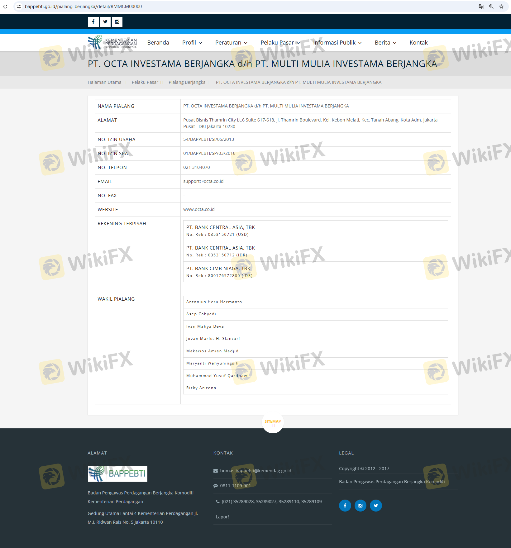 เกี่ยวกับความถูกต้องตามกฎหมายของโบรกเกอร์ฟอเร็กซ์ Octa ทางบริษัทได้มีการจัดเตรียม อินโดนีเซีย BAPPEBTI และ (ยังมีการสำรวจภาคสนามเกี่ยวกับความปลอดภัย)