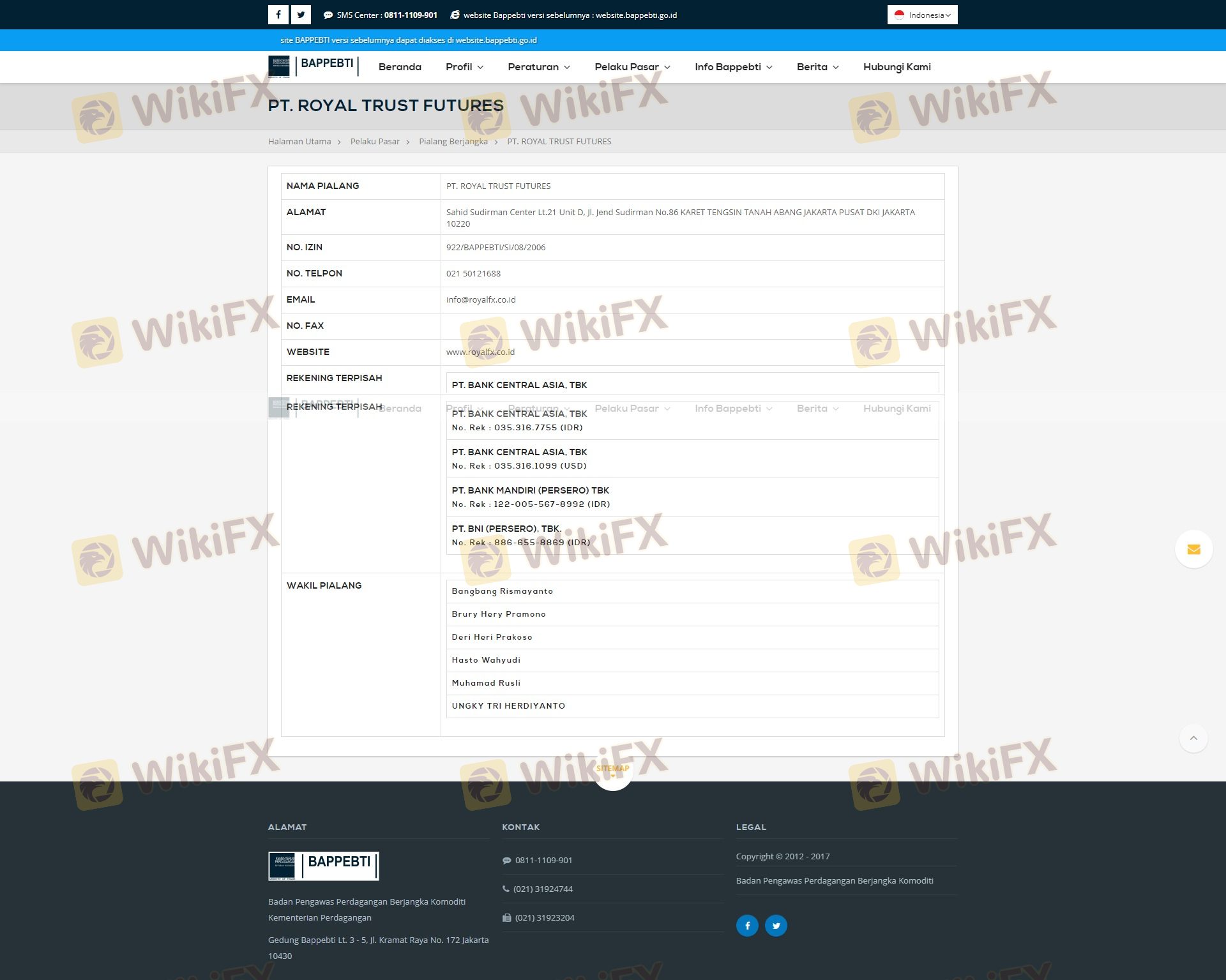 เกี่ยวกับความถูกต้องตามกฎหมายของโบรกเกอร์ฟอเร็กซ์ ROYAL TRUST FUTURES ทางบริษัทได้มีการจัดเตรียม อินโดนีเซีย BAPPEBTI และ (ยังมีการสำรวจภาคสนามเกี่ยวกับความปลอดภัย)