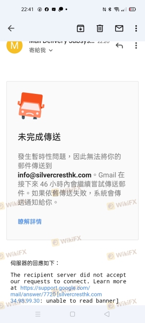 คะแนนการจัดอันดับอุตสาหกรรมล่าสุดของ SILVERCREST คือ 1.53 โดยคะแนนยิ่งสูง ความปลอดภัยยิ่งมาก (เต็ม 10 คะแนน) และยิ่งมีใบอนุญาตกำกับดูแลมาก ก็ยิ่งน่าเชื่อถือมากขึ้น 1.53 หากคะแนนต่ำเกินไป มีความเสี่ยงที่จะถูกหลอกลวง กรุณาเลือกโบรกเกอร์อย่างระมัดระวังเพื่อหลีกเลี่ยงความเสี่ยง