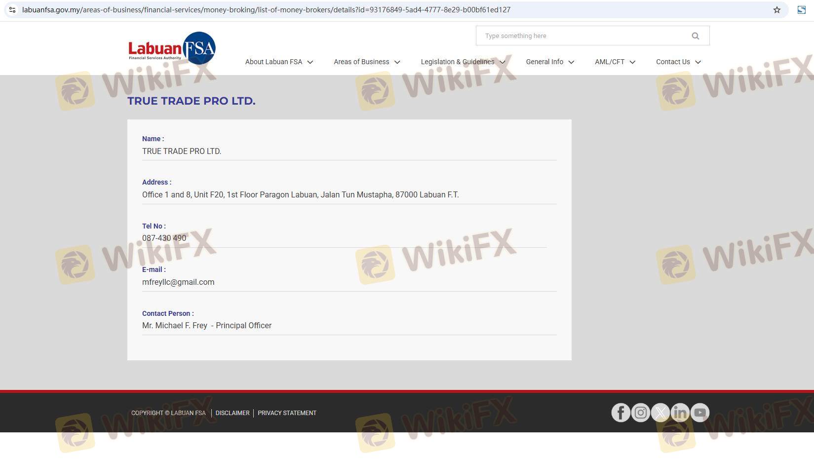 เกี่ยวกับความถูกต้องตามกฎหมายของโบรกเกอร์ฟอเร็กซ์ True Trade Pro Ltd ทางบริษัทได้มีการจัดเตรียม ประเทศมาเลเซีย LFSA และ (ยังมีการสำรวจภาคสนามเกี่ยวกับความปลอดภัย)