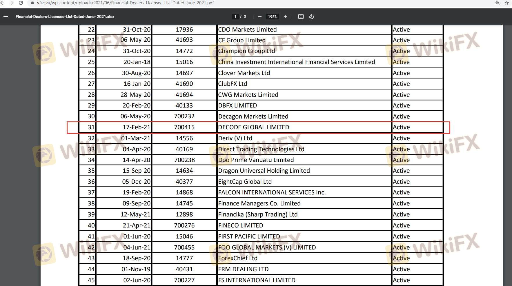 Tình trạng pháp lý của một nhà môi giới là yếu tố quan trọng để xác định tính an toàn và độ tin cậy của nó. Decode Global được quản lý bởi Ủy ban Dịch vụ Tài chính Vanuatu (VFSC), cơ quan thường được coi là cơ quan quản lý cấp 3. Mặc dù VFSC cung cấp một mức độ giám sát nhất định, nhưng các tiêu chuẩn quản lý của nó thường ít nghiêm ngặt hơn so với các cơ quan quản lý cấp 1 như Cơ quan Quản lý Tài chính (FCA) ở Vương quốc Anh hoặc Ủy ban Chứng khoán và Đầu tư Úc (ASIC).