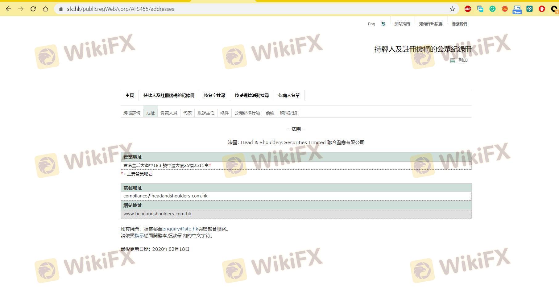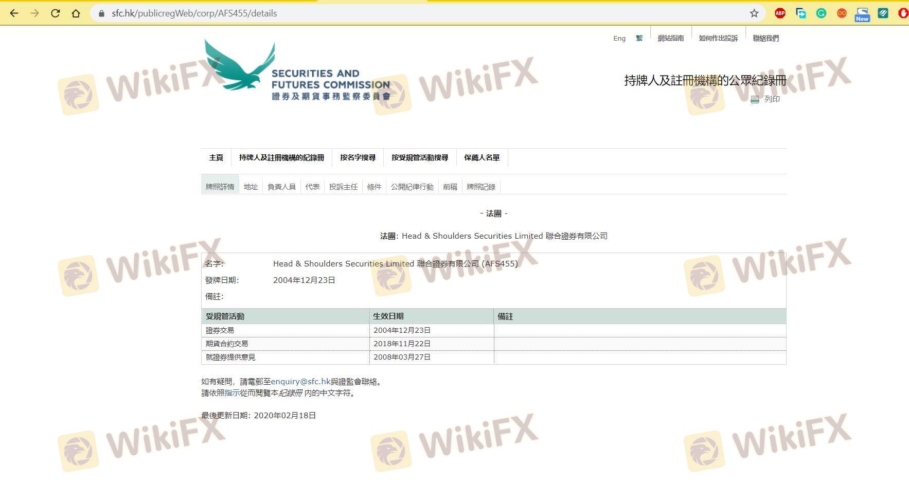 Dựa vào tính hợp pháp của sàn môi giới Head & Shoulders cung cấp Hong Kong SFC và (bạn có thể xem biểu đồ đánh giá về độ an toàn của nền tảng).