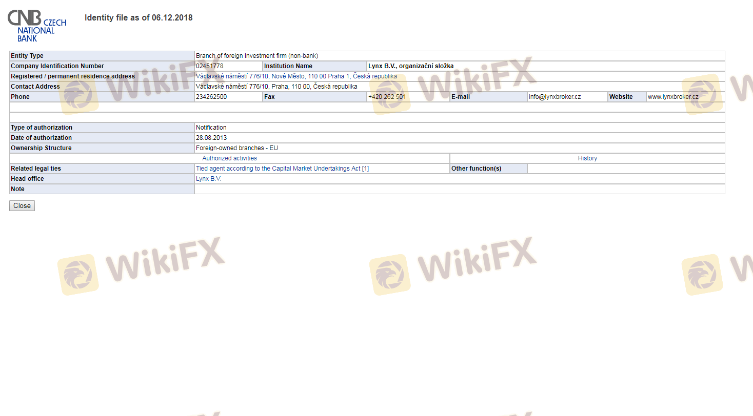 Dựa vào tính hợp pháp của sàn môi giới LYNX cung cấp Cộng hòa Séc CNB và .