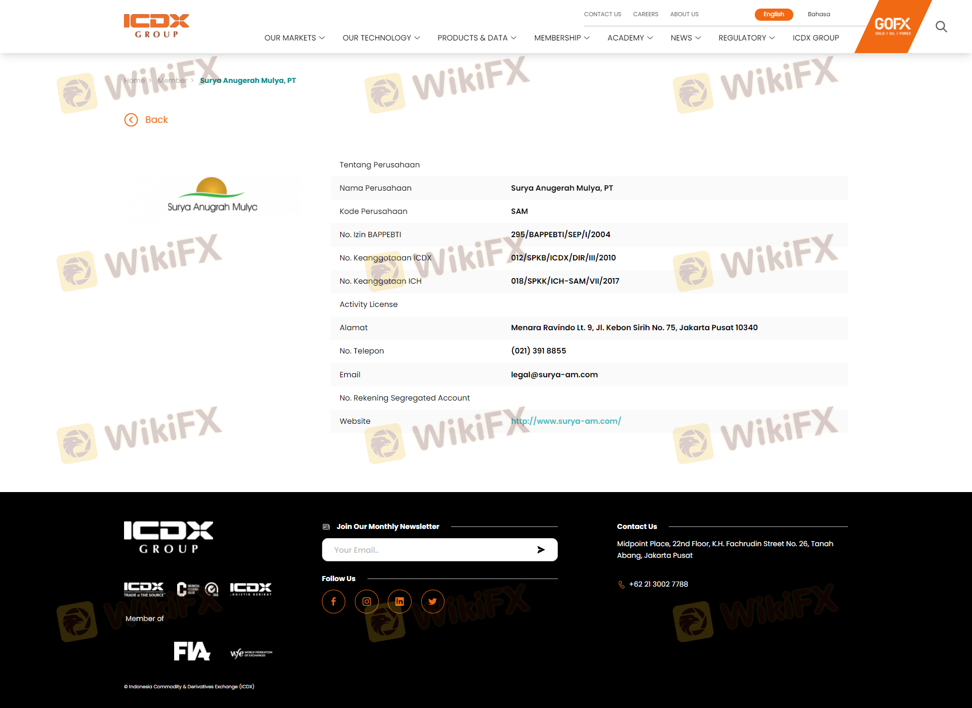 Khung quy định mà một nhà môi giới hoạt động dưới đó là rất quan trọng trong việc xác định tính an toàn và hợp pháp của nó. Surya tuyên bố được quy định bởi Sàn Giao dịch Hàng hóa và Phái sinh Indonesia (ICDX), cơ quan chịu trách nhiệm giám sát các thực thể giao dịch khác nhau tại Indonesia. Sự hiện diện của quy định thường là một chỉ số tích cực, vì nó ngụ ý sự tuân thủ các tiêu chuẩn hoạt động cụ thể và các biện pháp bảo vệ khách hàng. Dưới đây là tóm tắt thông tin quy định của Surya: