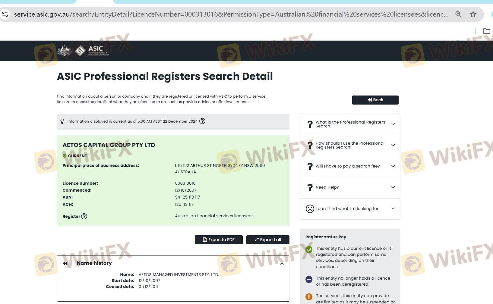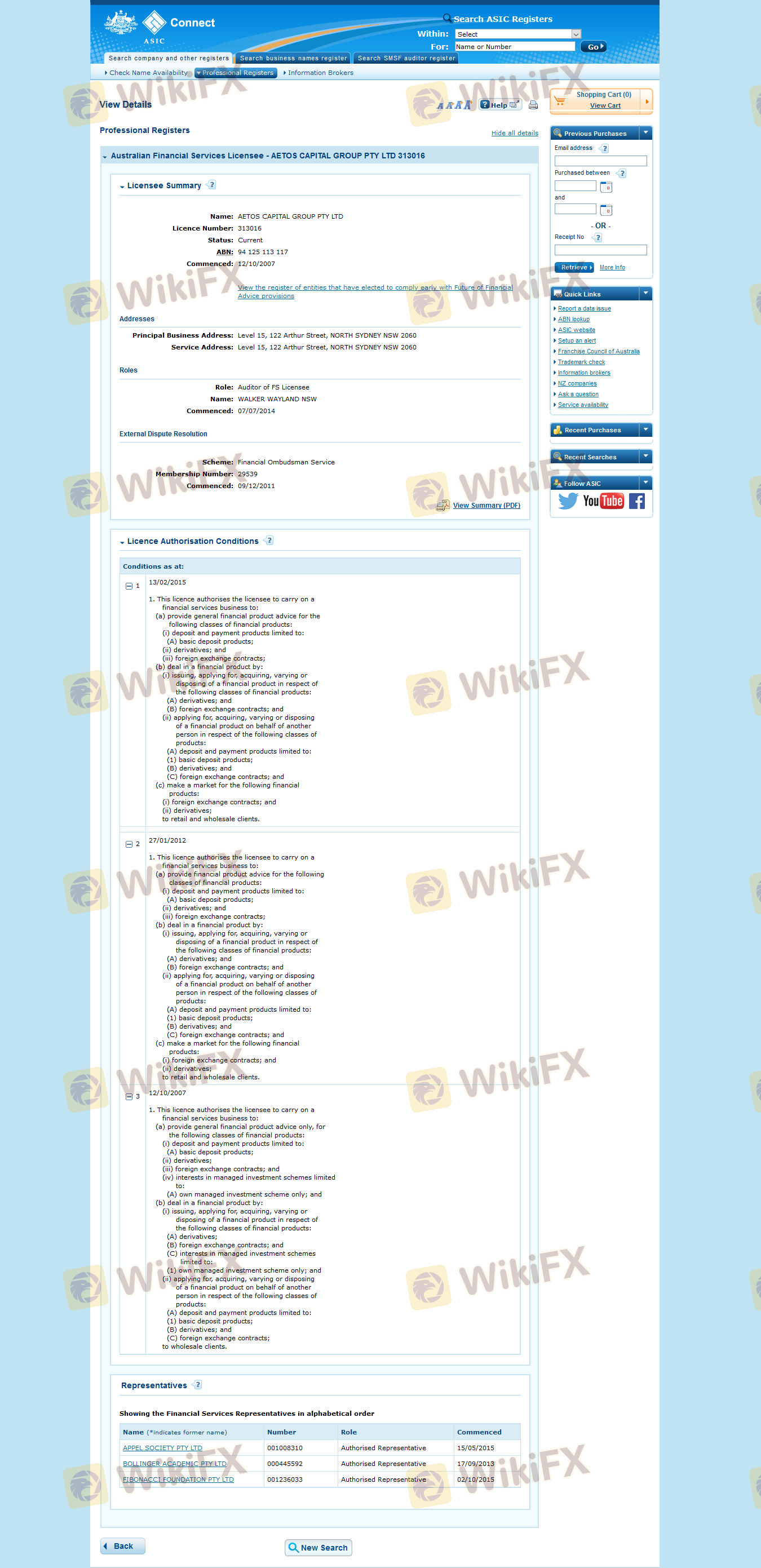 關於 AETOS 外匯交易商的合法性,它澳大利亞 ASIC,在(也有關於安全的實勘調查)。
