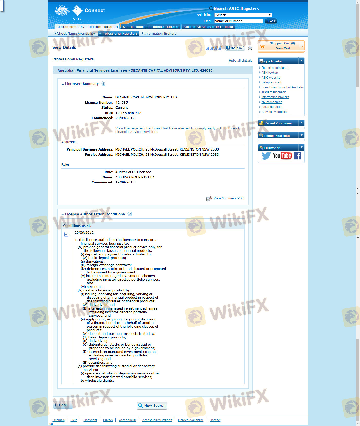 關於 DECANTE 外匯交易商的合法性,它澳大利亞 ASIC,在。