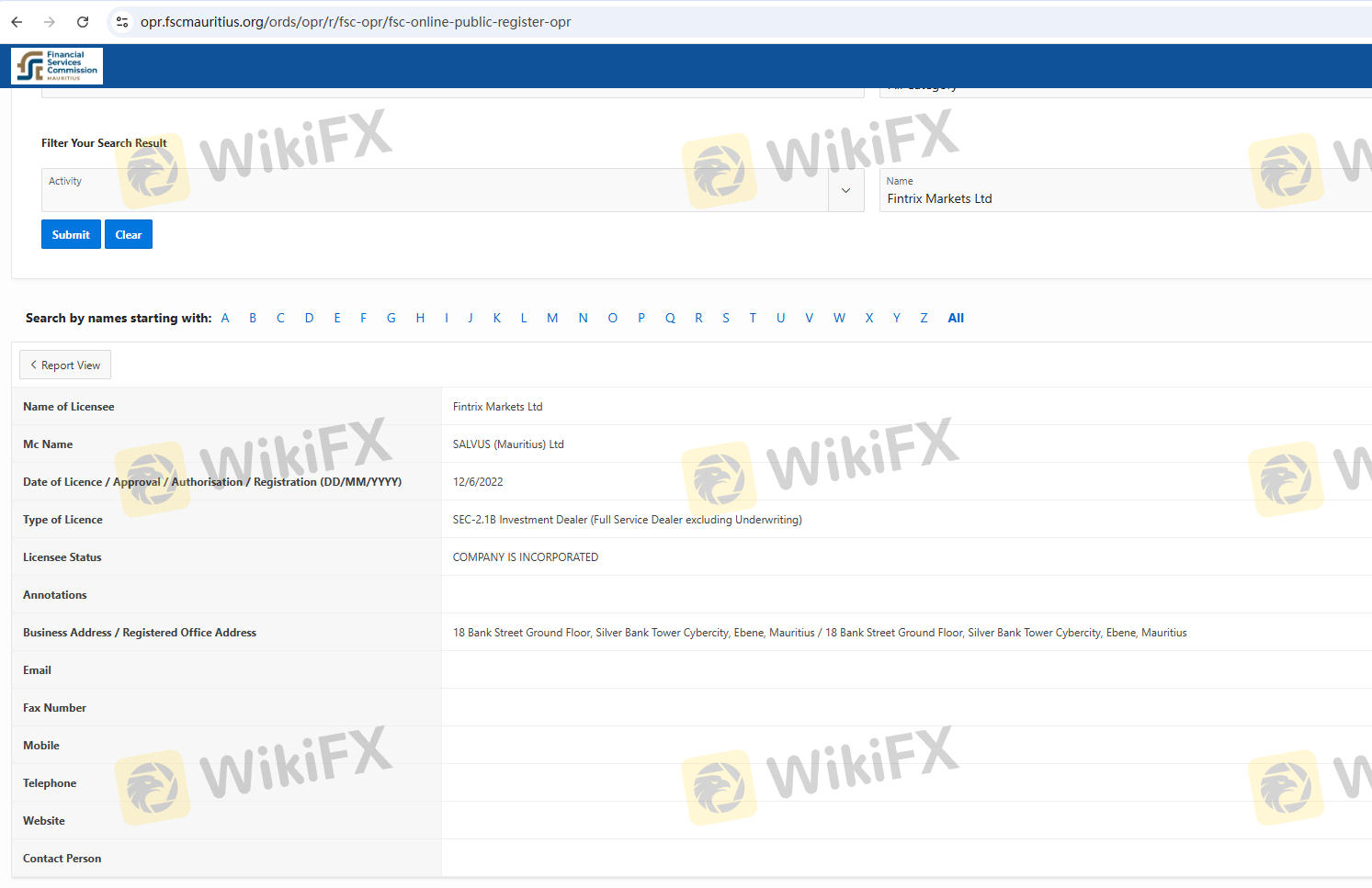 關於 Fintrix Markets 外匯交易商的合法性,它模里西斯 FSC,在。