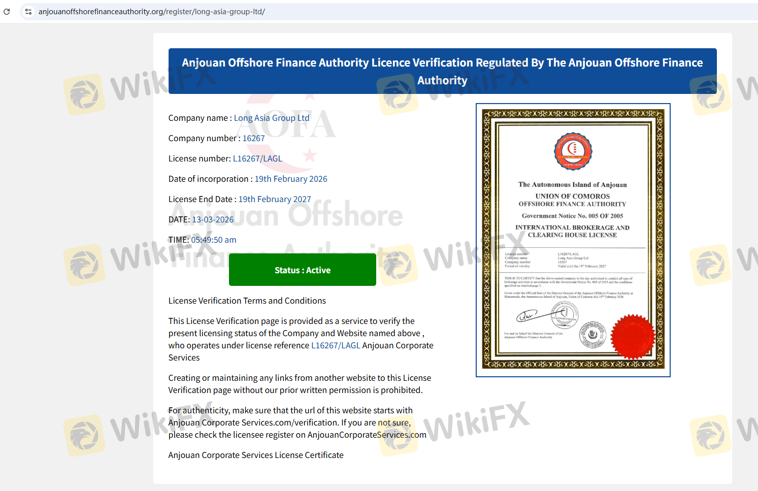 關於 Long Asia Group 外匯交易商的合法性,它科摩羅 AOFA,在。