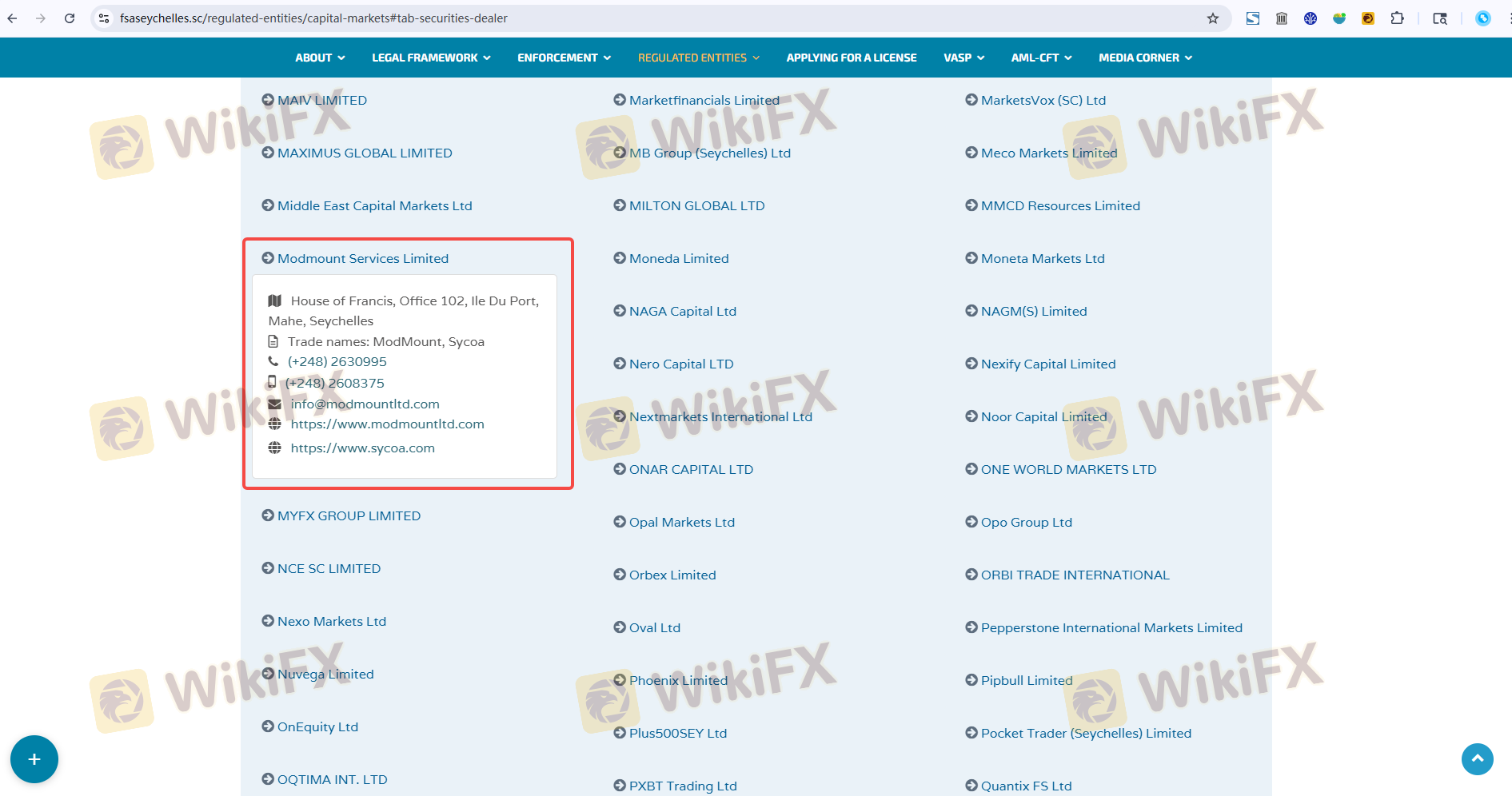 了解經紀商的監管狀態對於評估其合法性及客戶資金安全至關重要。ModMount 聲稱在塞席爾金融服務管理局的監管下運營,該監管機構負責確保金融機構遵守必要標準並保護投資者。