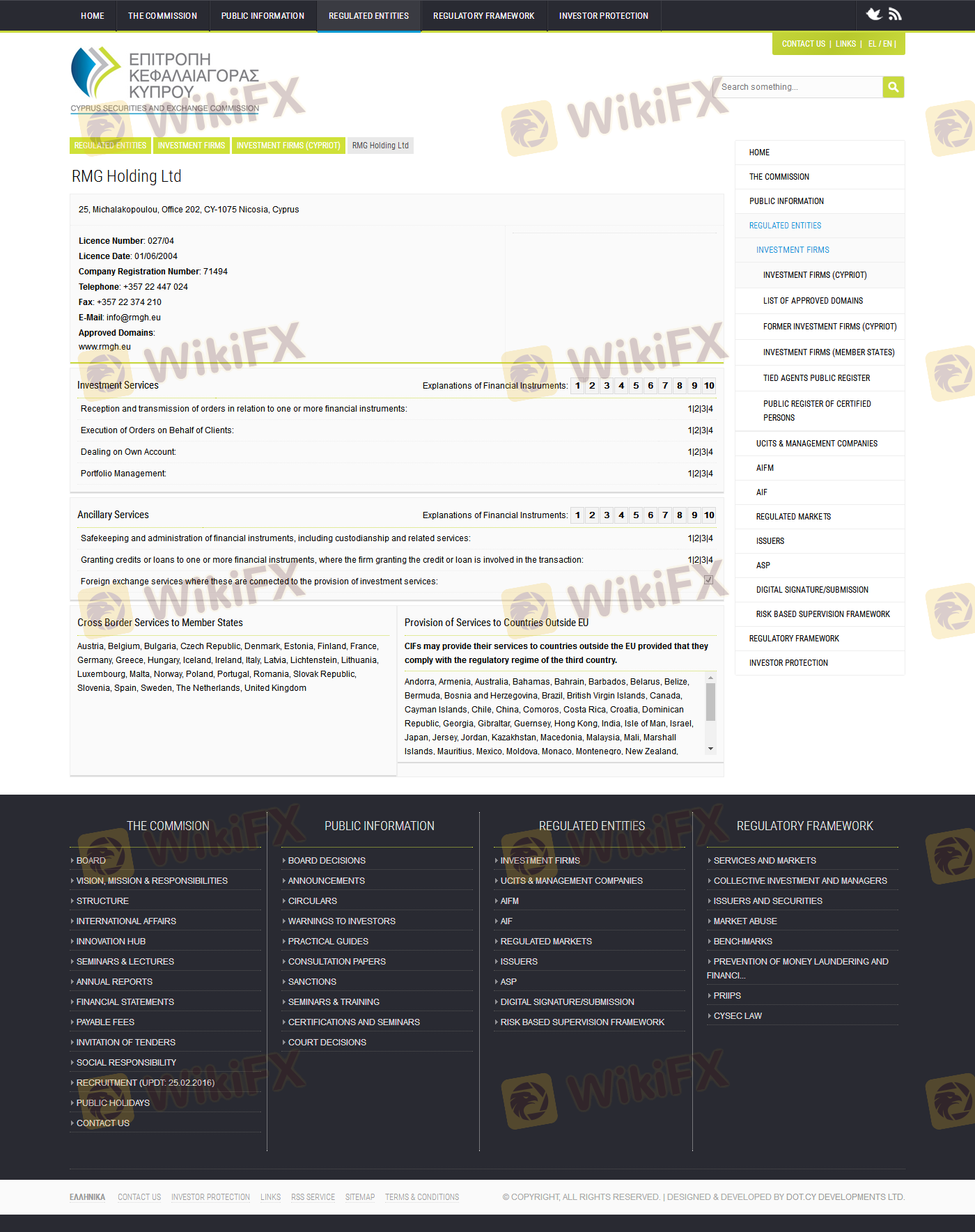 關於 RMG Holding 外匯交易商的合法性,它賽普勒斯 CYSEC,在(也有關於安全的實勘調查)。